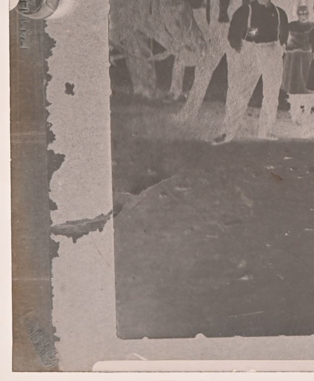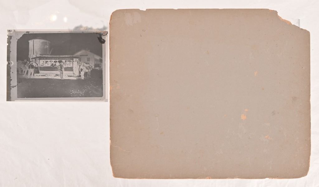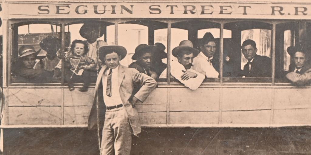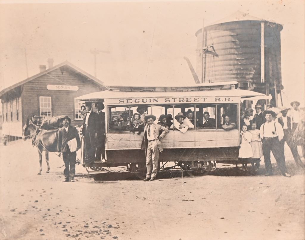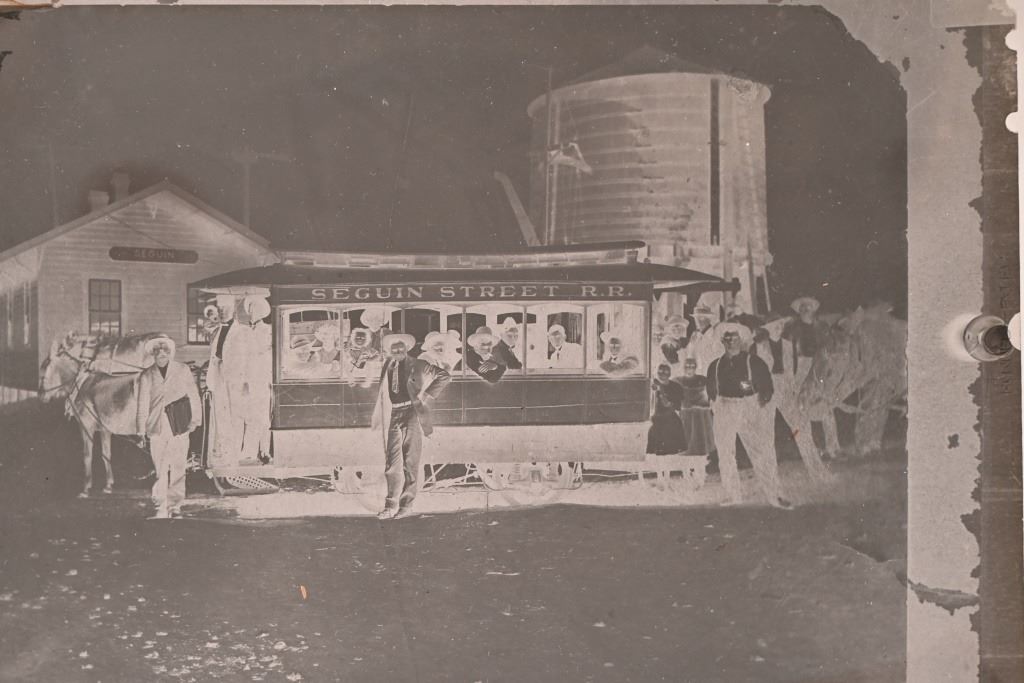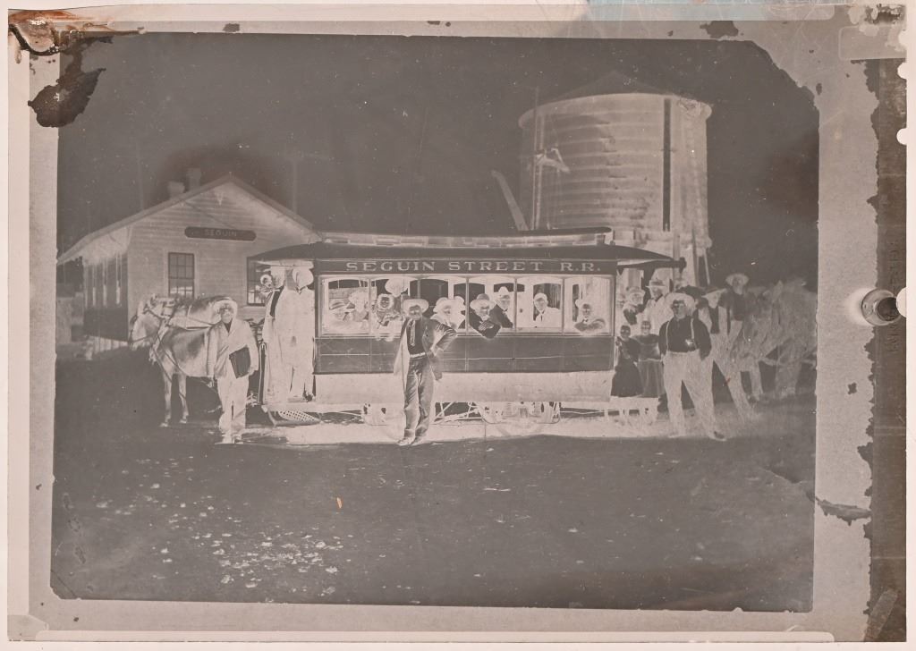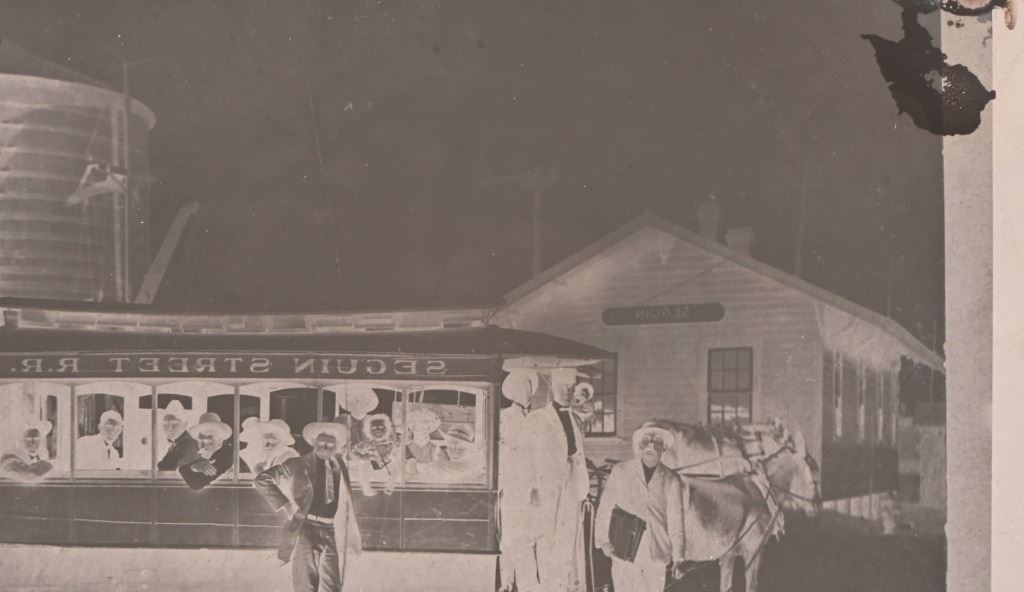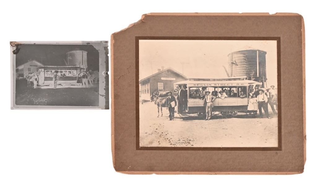 When the railroad was the primary economic force in Seguin, a rail line one mile long was extended to downtown to convey people and parcels downtown. This mule-driven line was Seguin's only public transportation system. In addition, the hotels that were in operation at that time had their private hacks which were forerunners to our so-called "courtesy cars" of today. Photo card measures 11.5" x 13.5". Negative measures 5" x 7"
