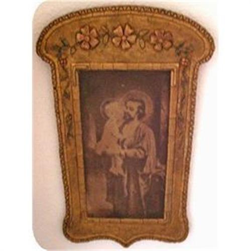 Antique Sepia print scene of Joseph holding the infant Christ in which the artist depicts the baby Jesus in a surreal and spiritual heavenly semi-transparency. Joseph's adoration and love is artistically depicted.<p>Print is mounted on a uniquely shaped and ornately carved, gilt and gesso piece of solid Mahogany. Crafting has a one-of-a kind appearance and expert execution with the charm of old world Germany. We believe the print itself is Italian. Frame with a motif of primitive floral garland follows the flow of the domed shape top. Green leaf vines flow downward on both sides of the middle border. Middle border is stippled and textured. Sepia is framed with a dentil motif and outer frame motif of spaced V carvings. The entire surface is a separate layer of gesso applied to the wood sepia mounting. Floral garland has a wash of color as do the trailing leaves. Heavy gold paint covers the entire front of the mounting. Back is stained.<p>Measures 20.5 inches long with a 12.5 inch width. Rated to be in near Fine condition with two specs of color loss on the print itself and relative to age. We estimate, based on subject and style, circa late 19th Century. Unknown artist and craftsman.<p>