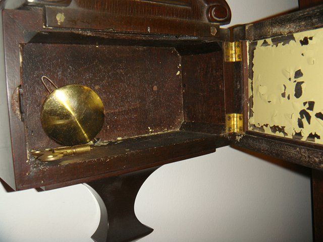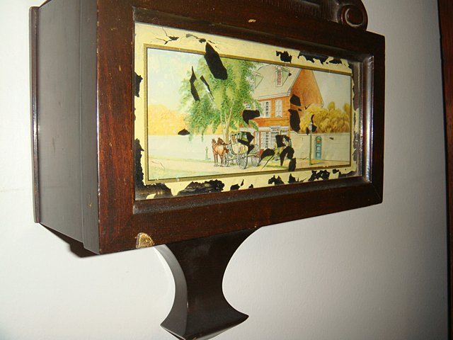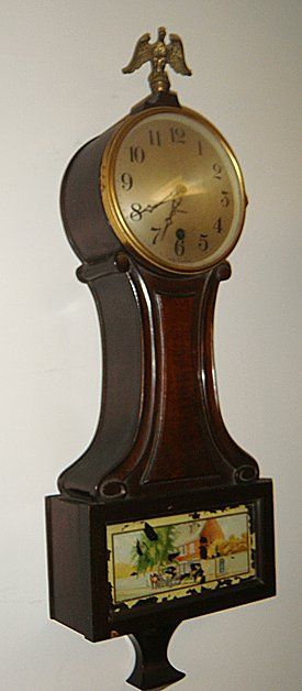 Antique Sessions Wall Clock, Single Wind, eagle top finial. 25" size. Has reverse painted lower glass of a stage coach and horses, early inn and does have some flaking on the glass. In nice original condition