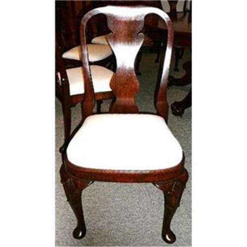This is a magnificent set of eight antique Queen Ann Style mahogany dining chairs consisting of six sides and two arms.