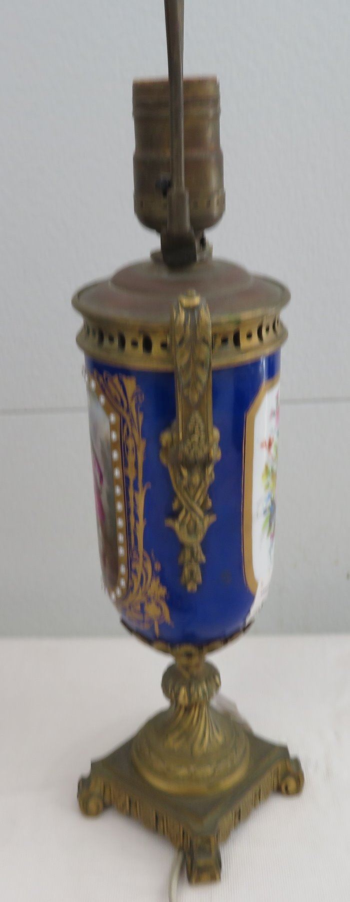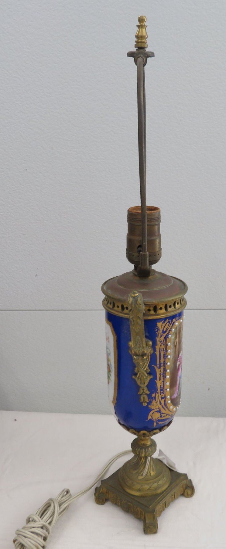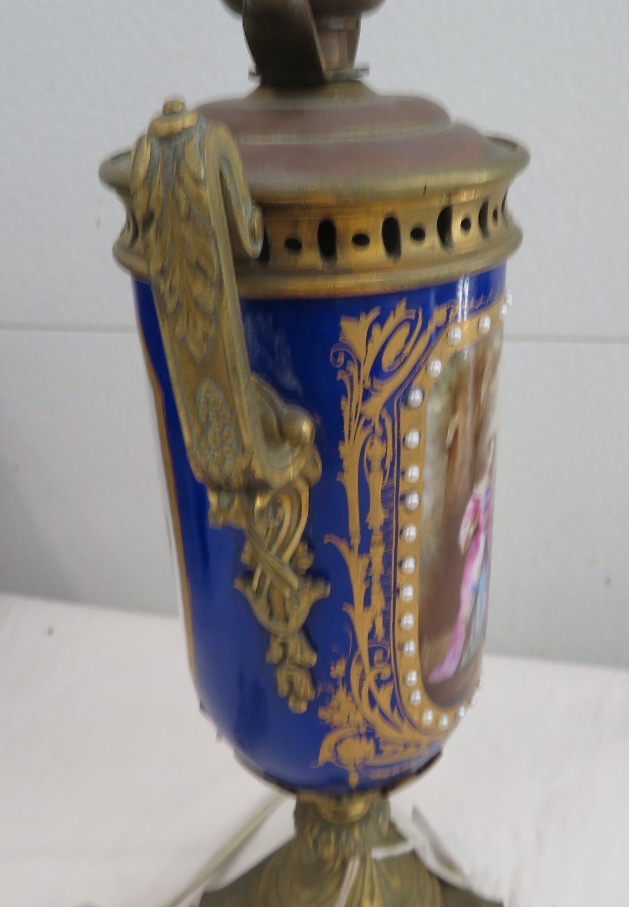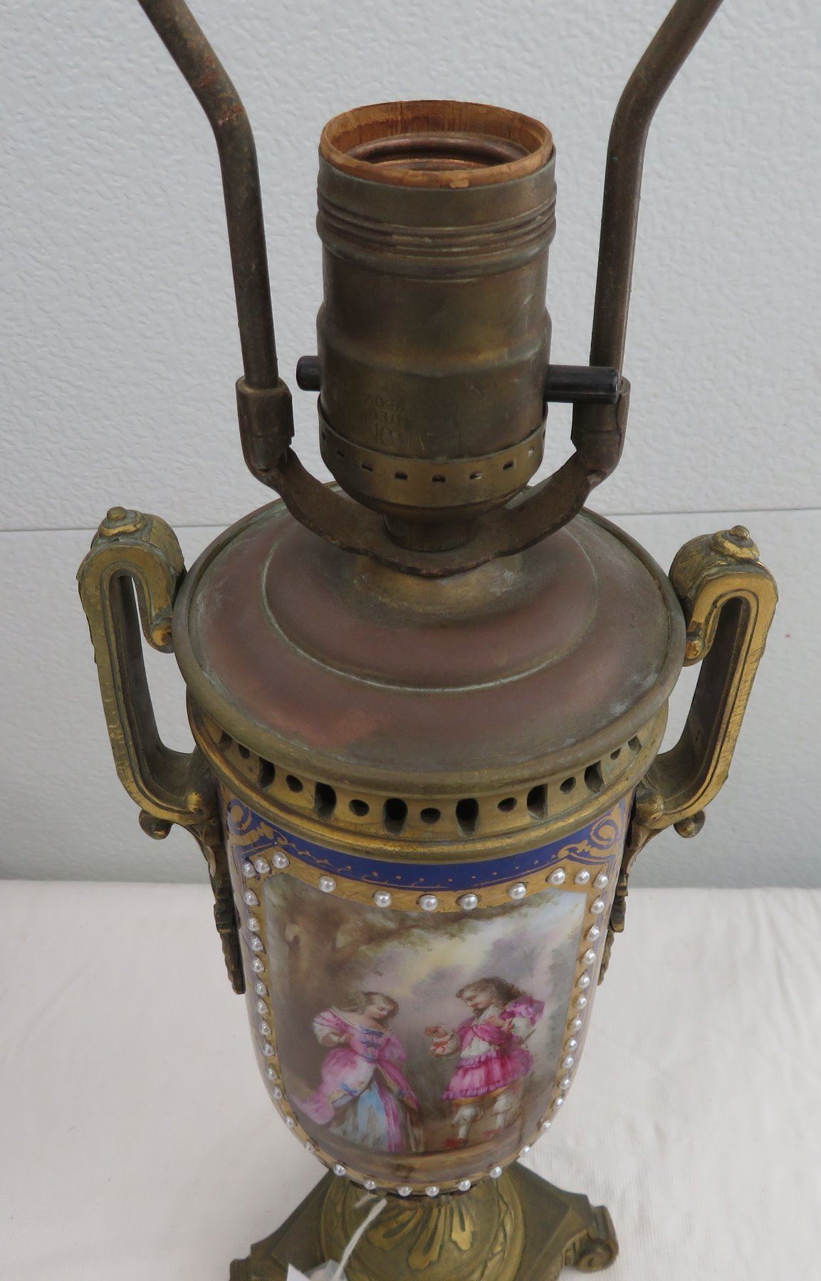 Antique Sevres Lamp, c. 19th century. Made of bronze, porcelain and pearls, the item measures 20" x 4 1/2" x 3". Europe. Condition: No shade, see images. Shipping: $40.00 USA estimate only, w/insurance and signature, double-boxed, due to size and weight.