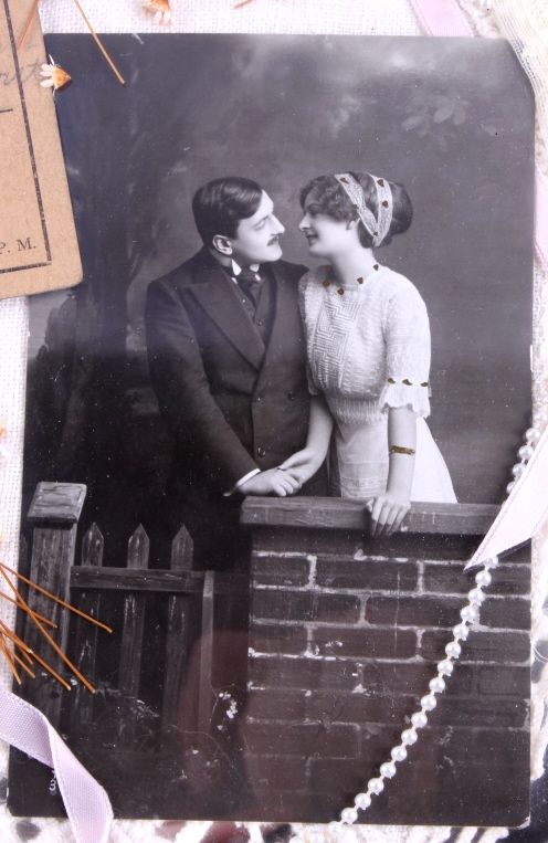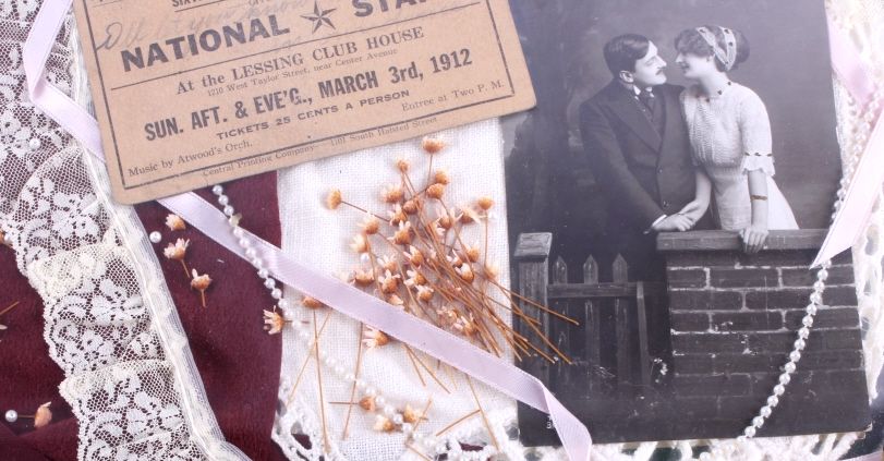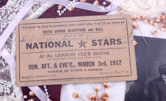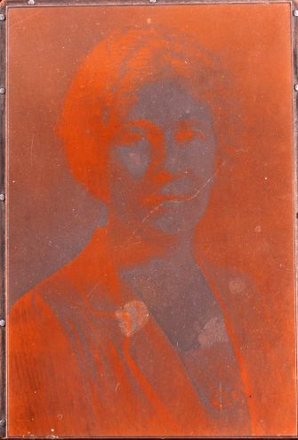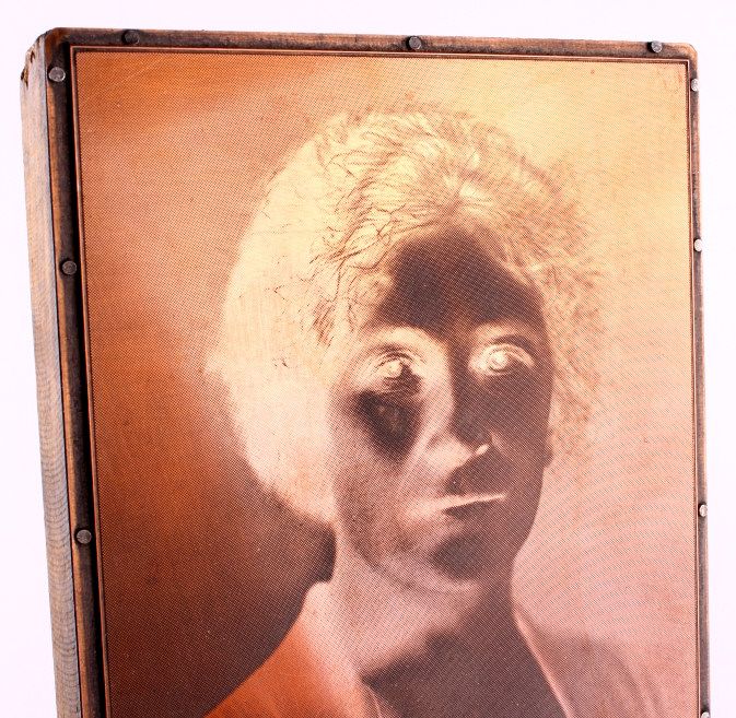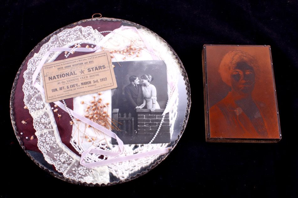 This is an antique shadowbox and copper print block. The shadowbox contains a card from the "Sixth Grand Reception and Ball" and a photograph of a young couple at the ball. It is dated from 1912. The copper print block is a portrait of an older woman. The shadowbox and print block are in good condition. The shadowbox is 11" in diameter.