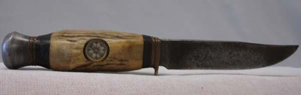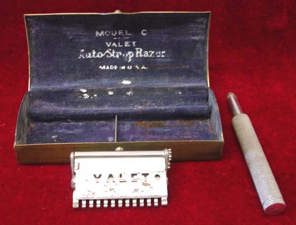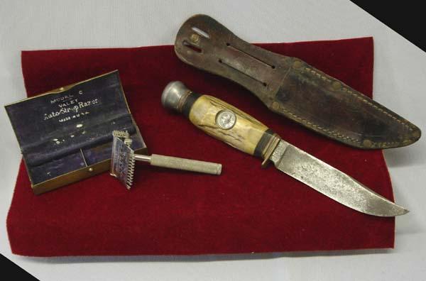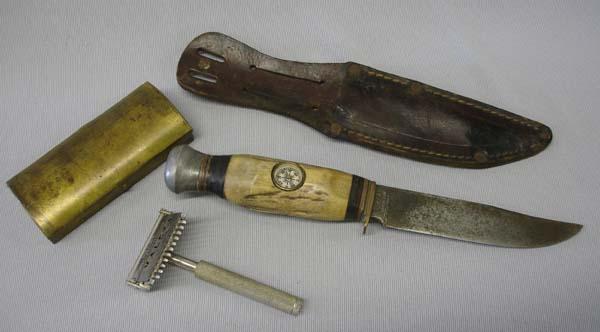 Antique Shaving Kit and Compass Knife. The knife has a bone handle and a leather sheath and measures 9'' long. The razor is in a brass case and is marked on the inside, ''Model C Valet Aut/Strip Razor, Made in U.S.A.'' SHI $20.