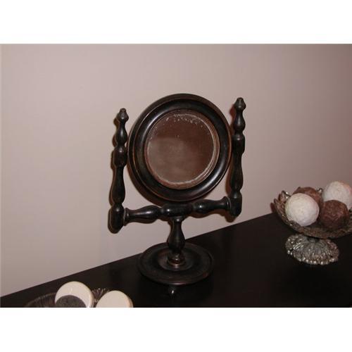 Antique Shaving Mirror. Mirror is framed in wood which is supended between two post and can adjust to the shaver. This is on a base that stands on three wooden ball feet. Very unusual. 11 1/2'tall, 7 1/2 ' wide with 4 1/2 base. Lovely Collectable.