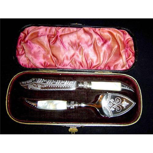 Antique Sheffield Silver Plate and Mother-Of-Pearl Knife and Spoon with Original Box. Circa. 1900 - 1920