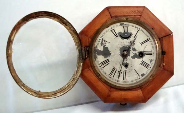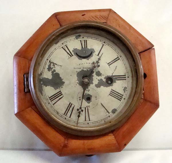 Antique Ship's Clock. Does not run. Glass door intact. On the frontof the face is marked "Patent Lever Escapement". Measures approx. 2 1/2'' front to back x 9'' Diameter. Buyers Pay Actual Shipping and Handling Charges(see terms and conditions for more information).