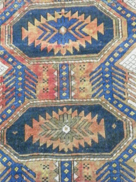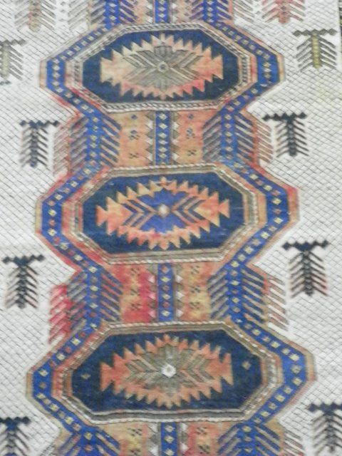 Ivory background, worn condition. Approx. 66" x 47". Please read our terms of sale.