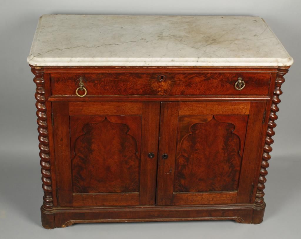 Walnut with turned wood design, white marble top, single drawer on top and low gallery cabinet. 36" X 28" X 17".