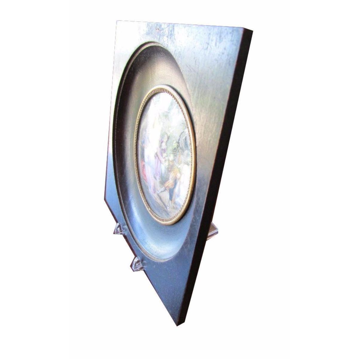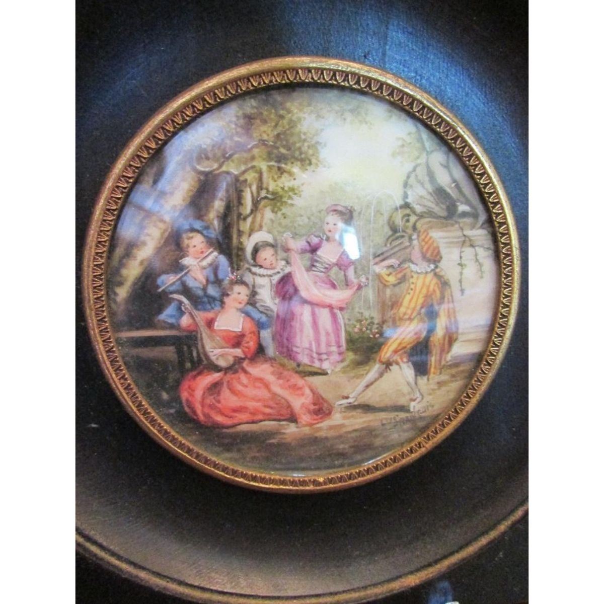 Museum quality hand painted miniature painting on porcelain depicting a royal court scene with musicians, a dancer & a jester. Wooden frame with metal trim measures 5 1/2 "H x 5 3/8"W. 3"D image. Signed Luc Francois.Â