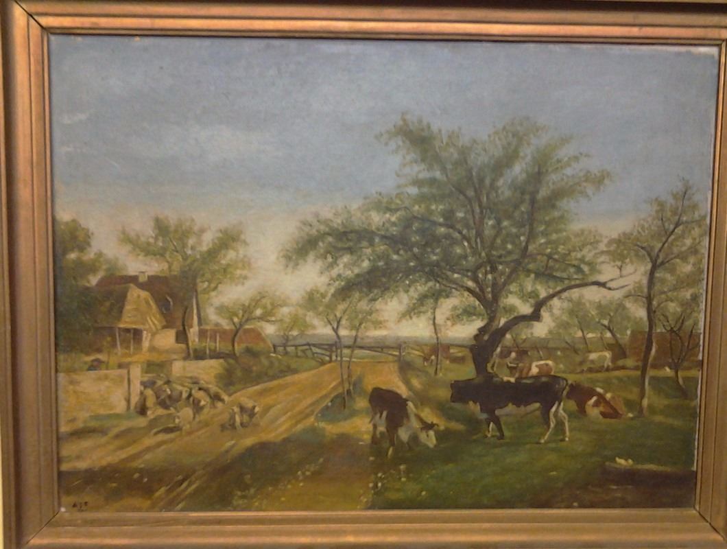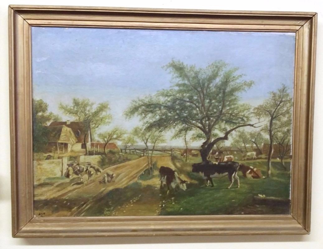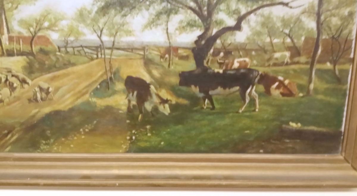 Antique Framed Oil on Canvas: Farmhouse Setting with Cows Grazing