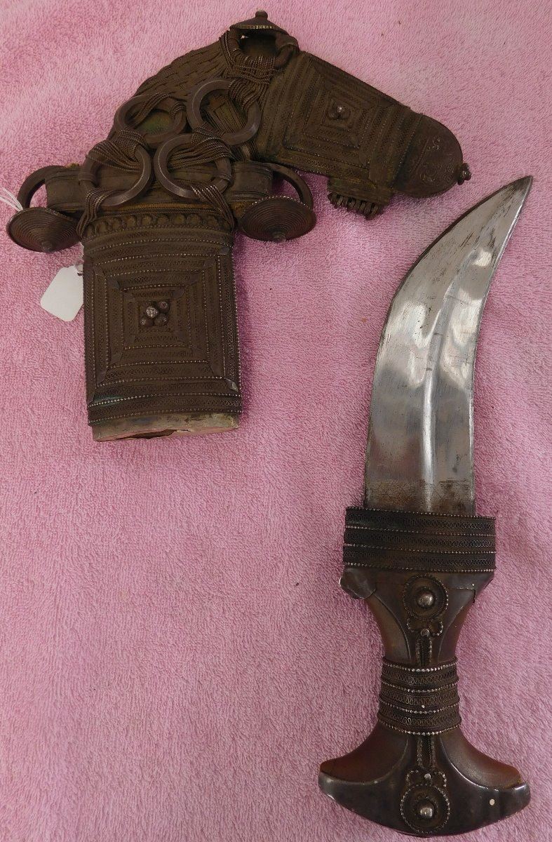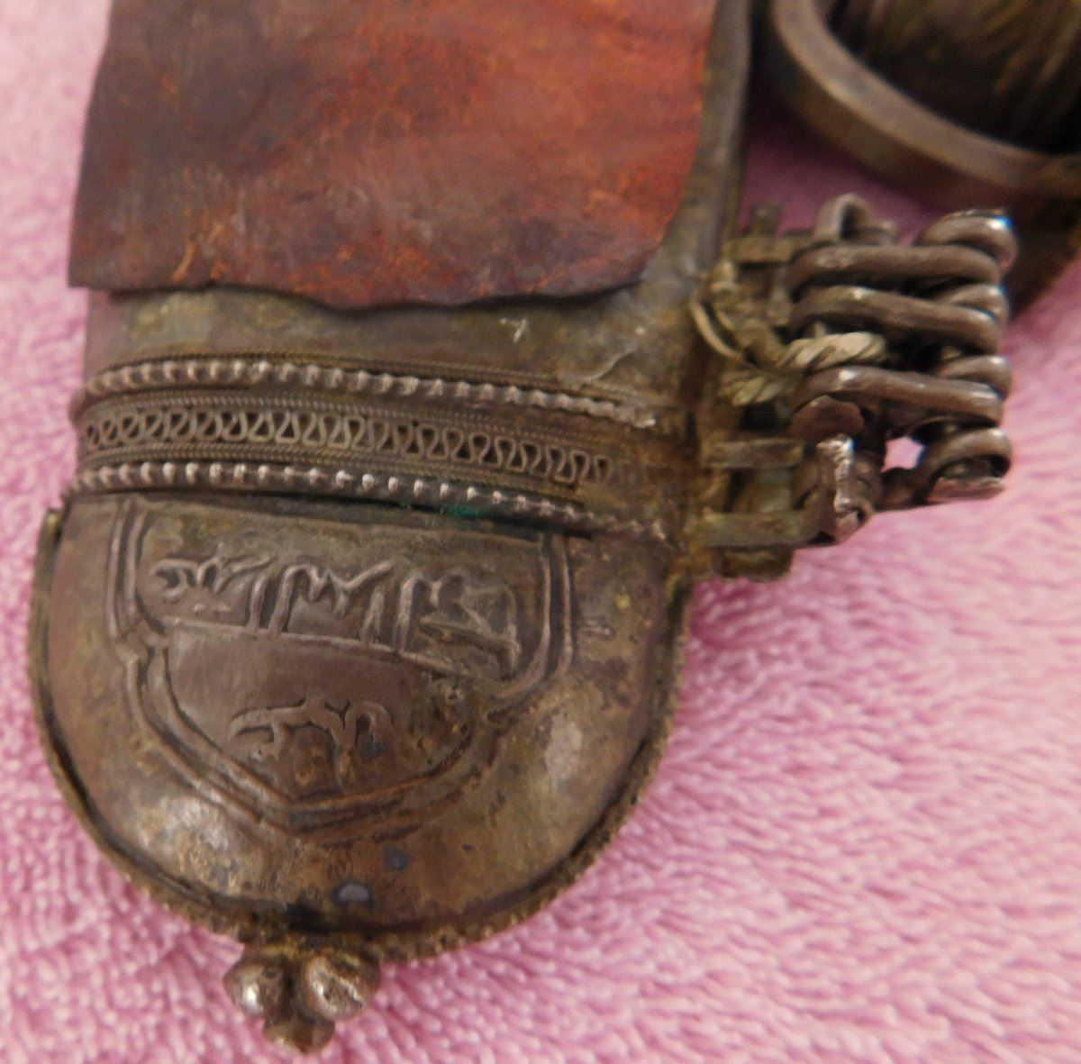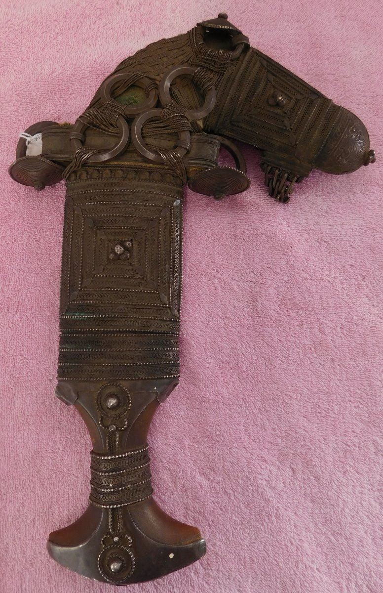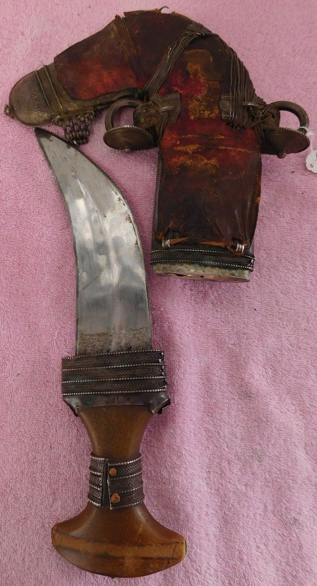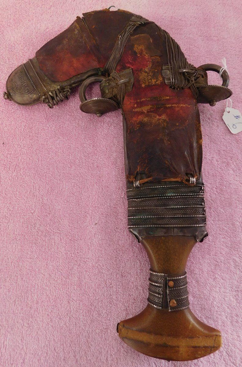 Antique Silver Dagger, circa 1900. Made of steel, horn, silver and camel tongue, the item measures 13" x 9" x 2". From Iraq. Very fancy knive and engraving. Condition: Minor damage, see images. Shipping: $30.00 w/insurance and signature.