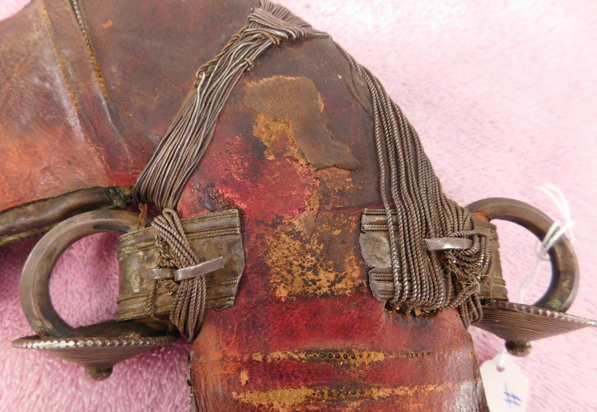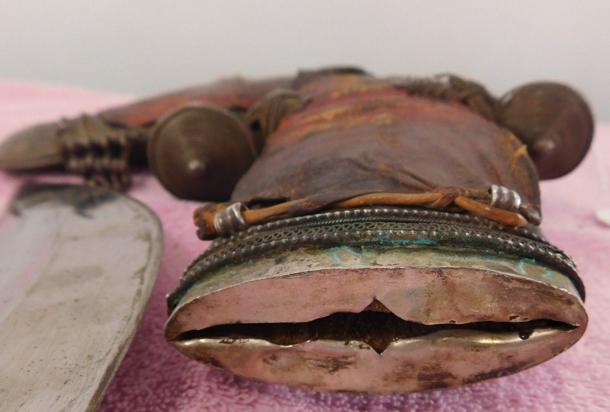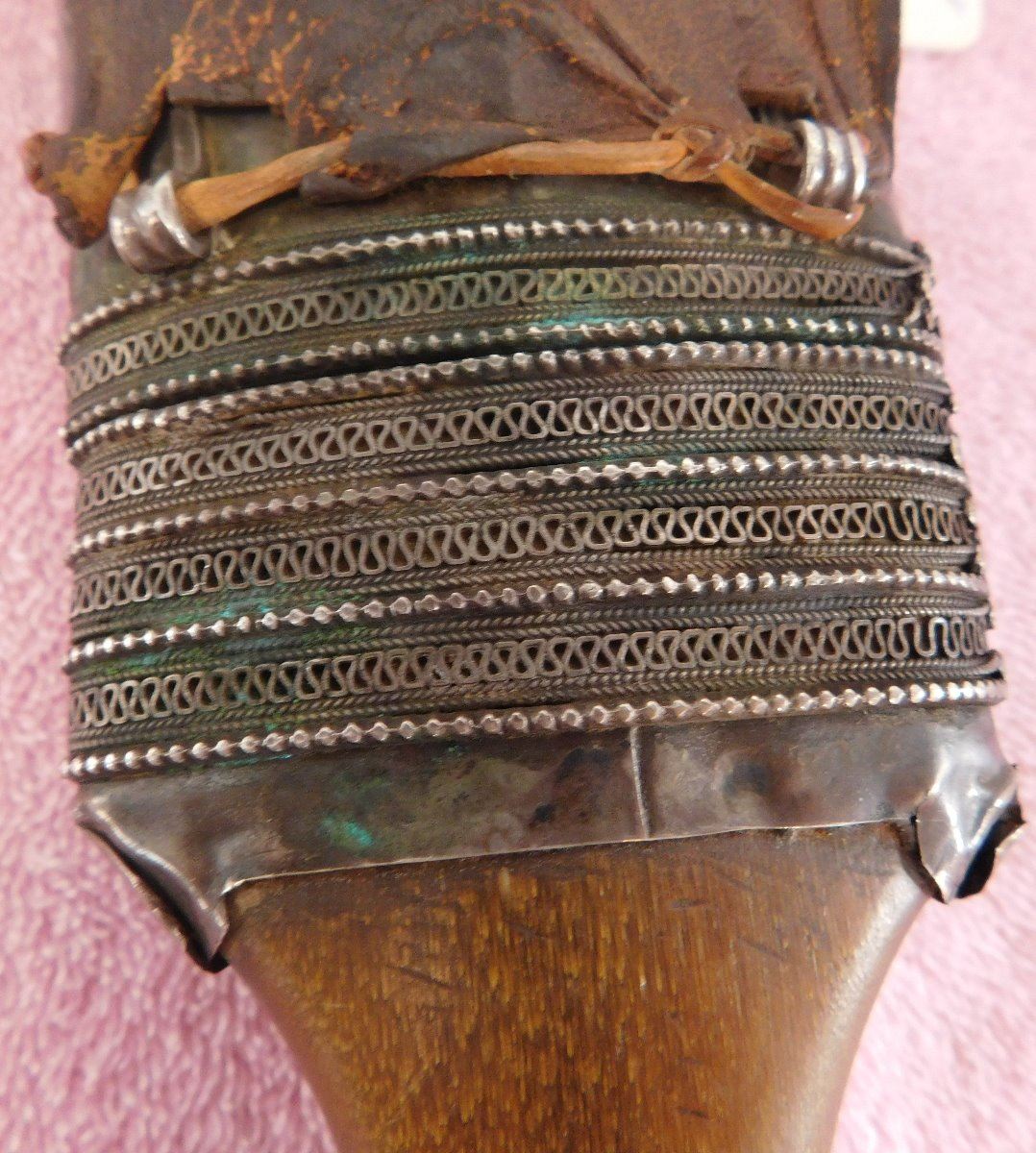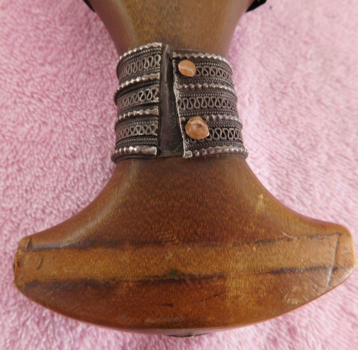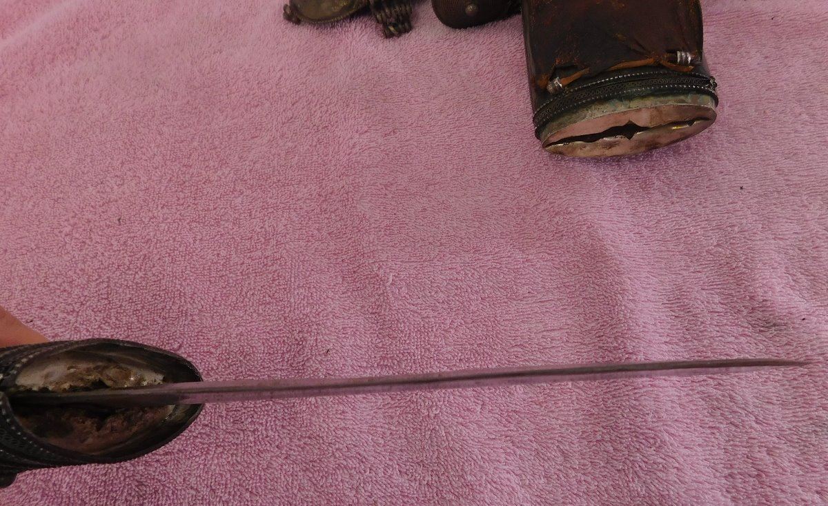 Antique Silver Dagger, circa 1900. Made of steel, horn, silver and camel tongue, the item measures 13" x 9" x 2". From Iraq. Very fancy knive and engraving. Condition: Minor damage, see images. Shipping: $30.00 w/insurance and signature.