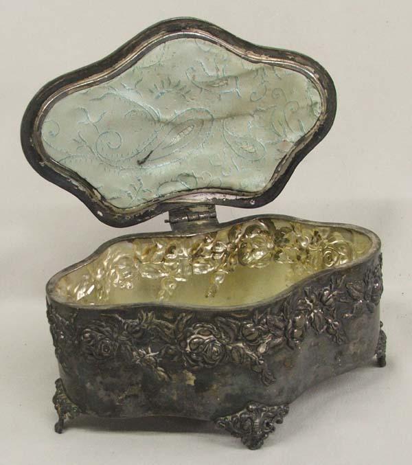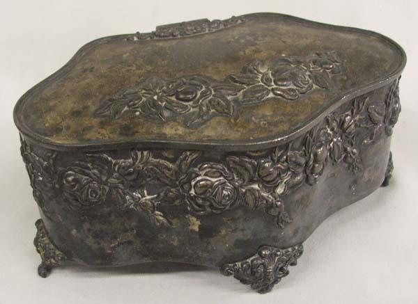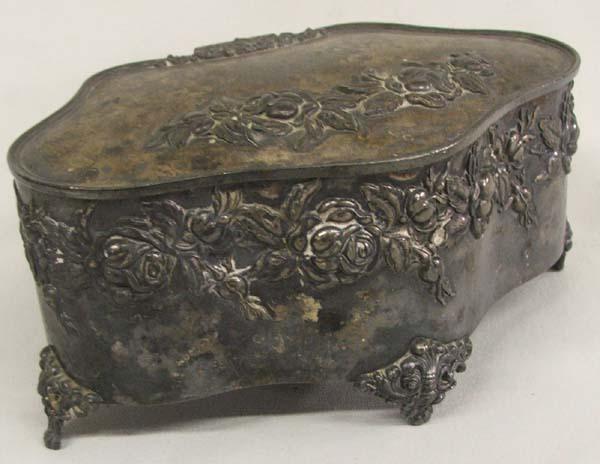 Antique Silver Plated Powder Box. Measures approx. 3''H x 6 1/3''L x 4''D. Has ''Derby Silver Co., Quadruple Plate'' on the bottom. Buyers Pay Actual Shipping and Handling Charges(see terms and conditions for more information).