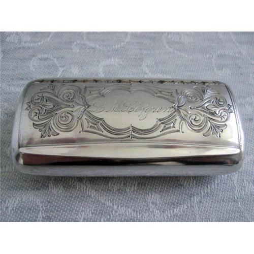 Beautifully engraved silver Snuffbox. It is made in Sweden 1903 (A7). It has a nameinscription. L:9,1 cm W:4,5 cm and H:2,5 cm. Weight is 90 g.