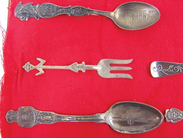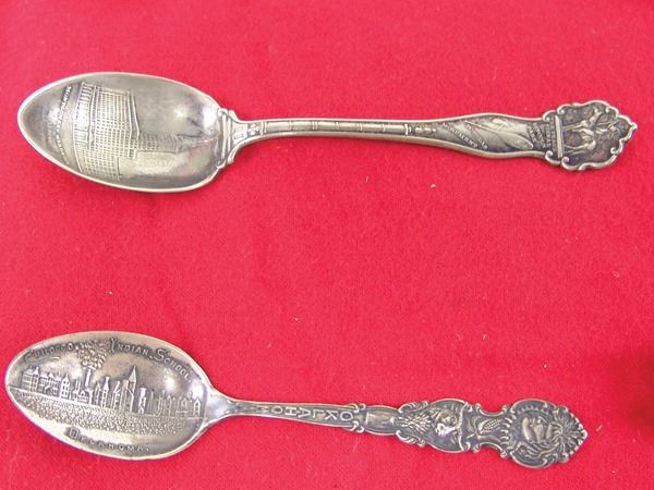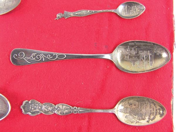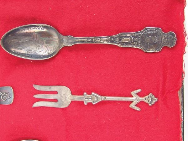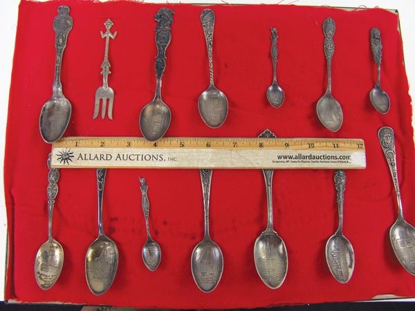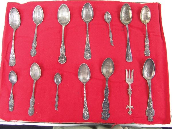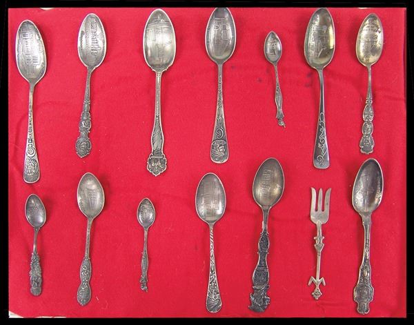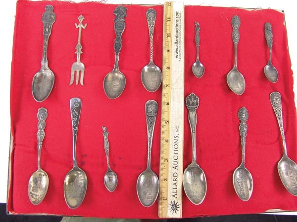 Group of 14, interesting, all silver souvenir collection spoons most with native themes, from many different US locations. Very good condition.Early/Mid 1900sLargest 6"