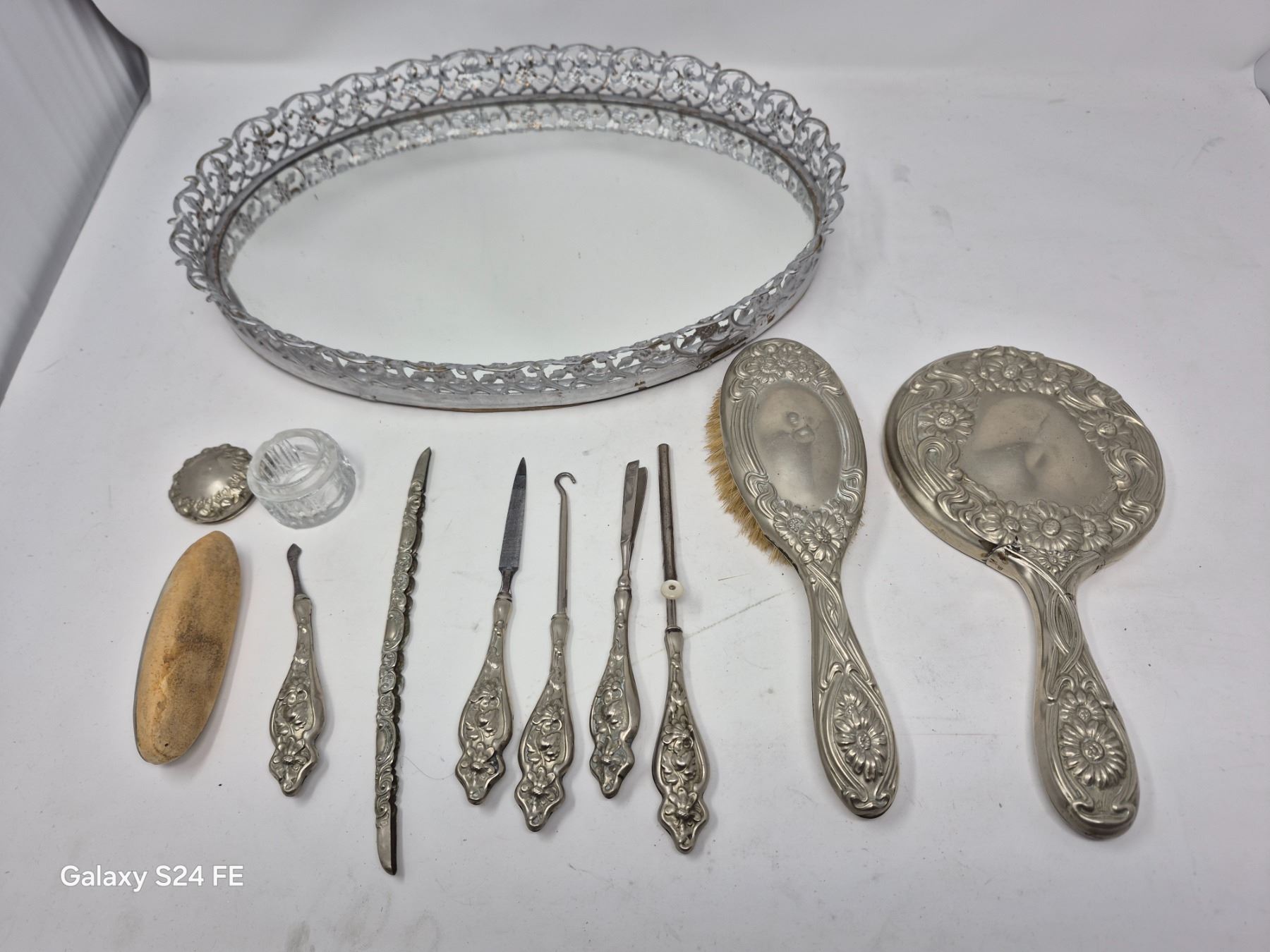 Ornate Art Nouveau vanity set featuring hand mirror, brush, nail tools, and mirrored tray. Floral repousse design. Some age patina present.
