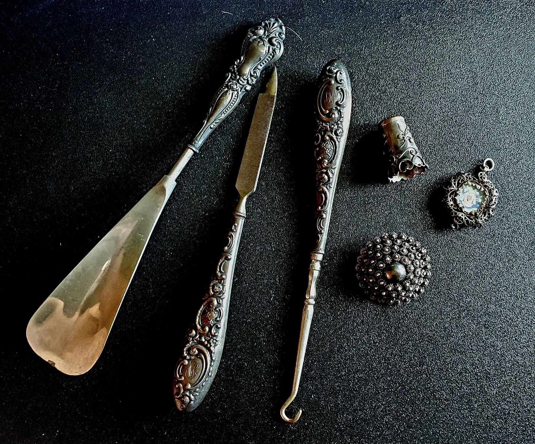 6 Antique Victorian Sterling Silver pieces, includes a Nail File, Shoe Horn, Button Hook, Thimble, Brooch and a Pendant. The button hook is 8.75 inches Long. All in very good condition.