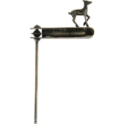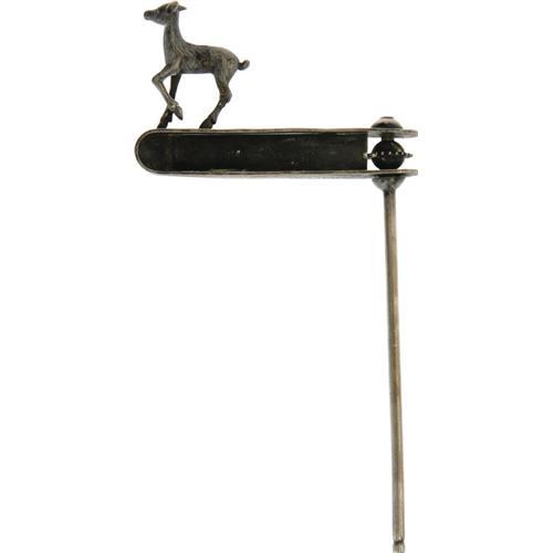 <B>Antique Silverplate Figural Noisemaker,</B></I> 2.5" x 5", unmarked, but possibly Sheffield, ca. nineteenth century. When rotated counter-clockwise, a small toothed wheel rasps against a plate to create sound. Surmounted by a small figure of a young deer. Some wear to deer and plate, tarnished. Overall very fine. It has been suggested that this noisemaker was used to call in hunting dogs.<BR><BR><b>Shipping:</b> Miscellaneous Collectibles, Smal (<a target="_blank" href="http://www.heritageauctions.com/common/shipping.php">view shipping information</a>)