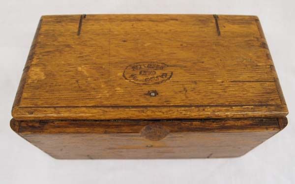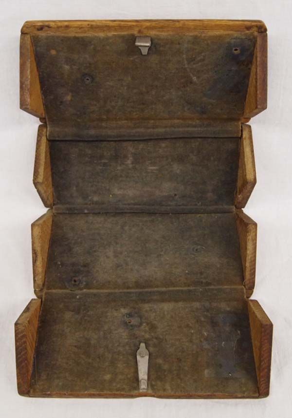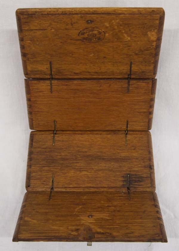 Antique Singer Sewing Machine Oak Puzzle Box, 1889. Quarter sawn oak puzzle box, folds in four sections, lined in velvet. Originally ws a box for Singer Sewing Machine parts and attachments. Dove-tailed joints with copper wired hinges. Measures 6.25'' x 3.5'' x 3.5''. Spring activated closure still works, stamped with patent date.