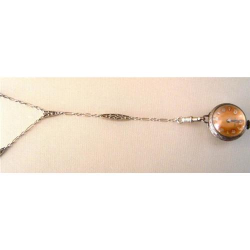 Swiss. Watch is silver. the chain is 14K white gold, tested with 14k acid. Chain measures 25 inches long. The drop is 4 1/4 inches long.