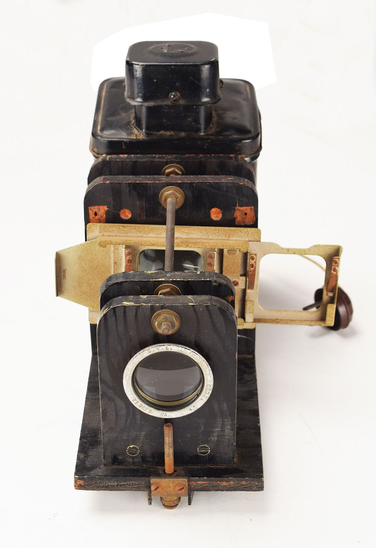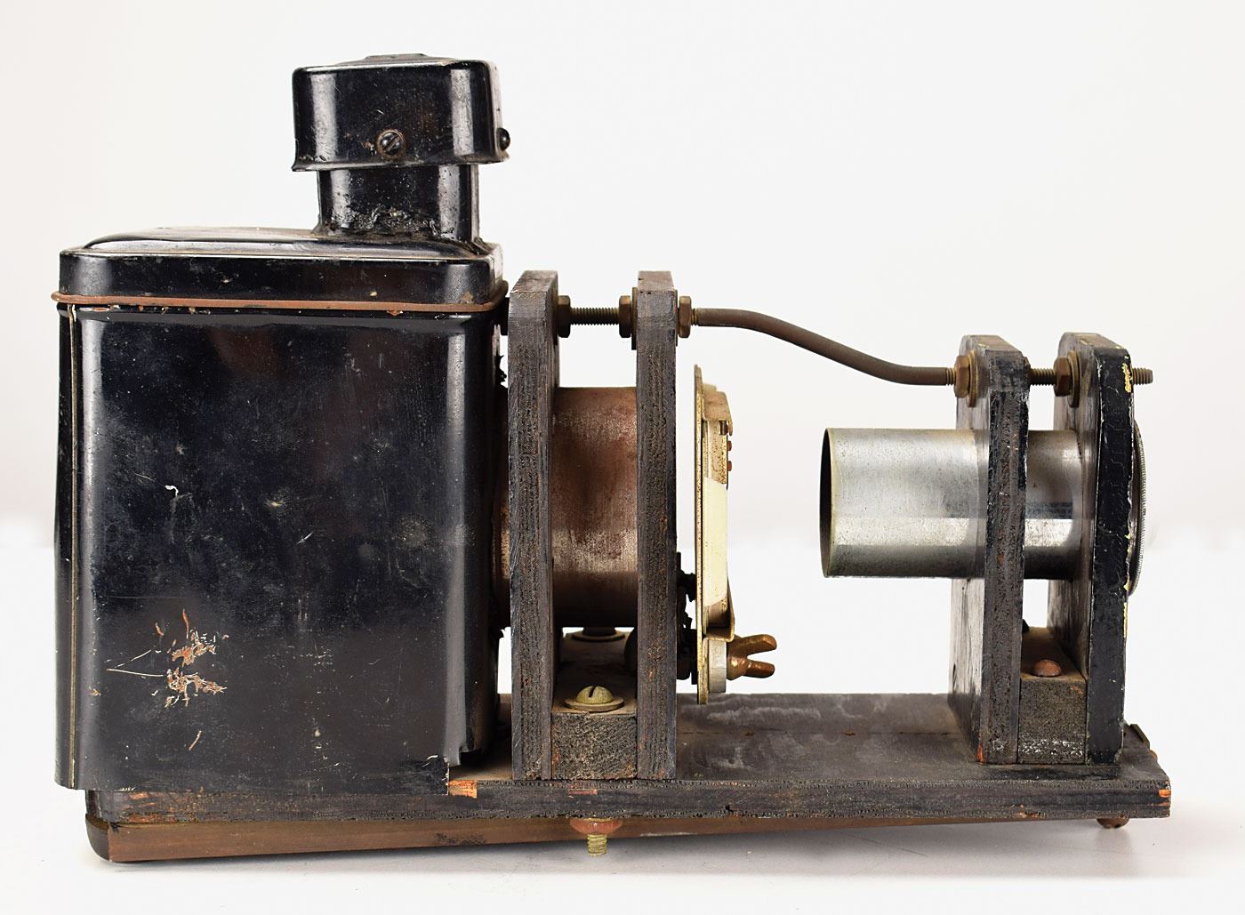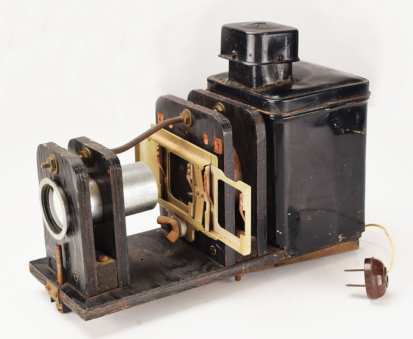 Antique slide projector, measuring 10? x 8? x 6.5?, featuring a lens on the front marked "S. V. E., Series 0A, 4? Focus." Retains the original power cable. In very good condition.
