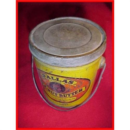 This small antique 4" tall tin pail once held "Pallas Peanut Butter" that was made for "Ridenour Baker Grocery Co." of Kansas City, MO. The desirable lithographed tin comes with the lid and handle. I would guess that this pail is around 1920's. Fair condition with some scuffing and slight denting. I bought this from a local antique collector.