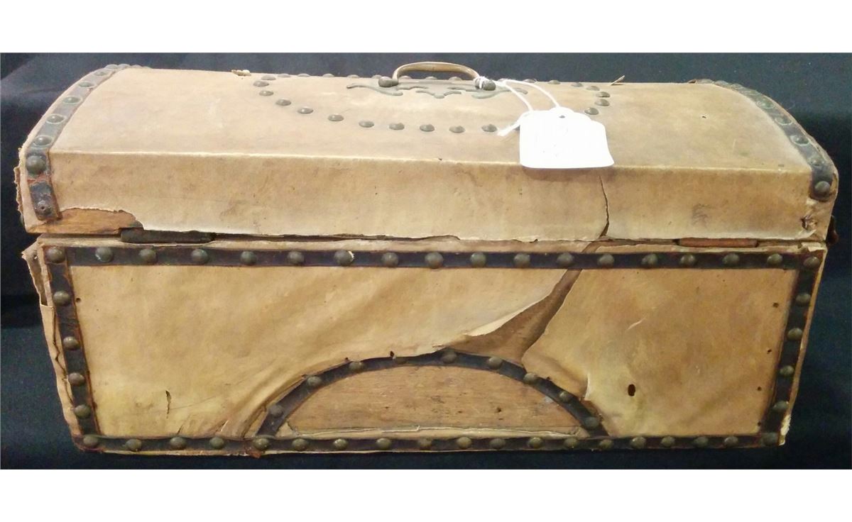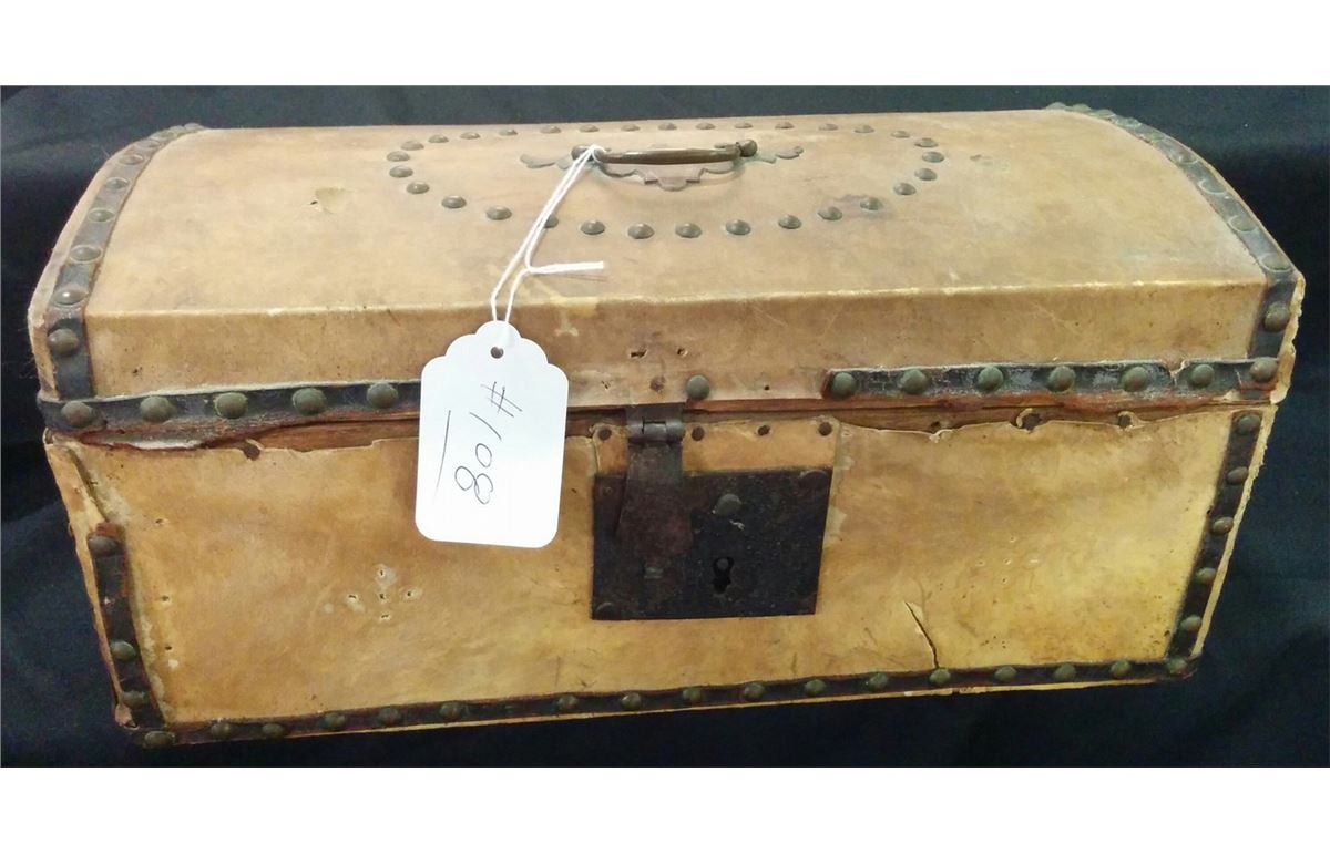 Antique Small trunk made from wood, tacks, hide and steel. This truck is 14x9x9 inches. This shows heavy use has it came over on wagon train. Date on newspaper inside box reads "July 9, 1832." Very rare item. Shipping $25.00