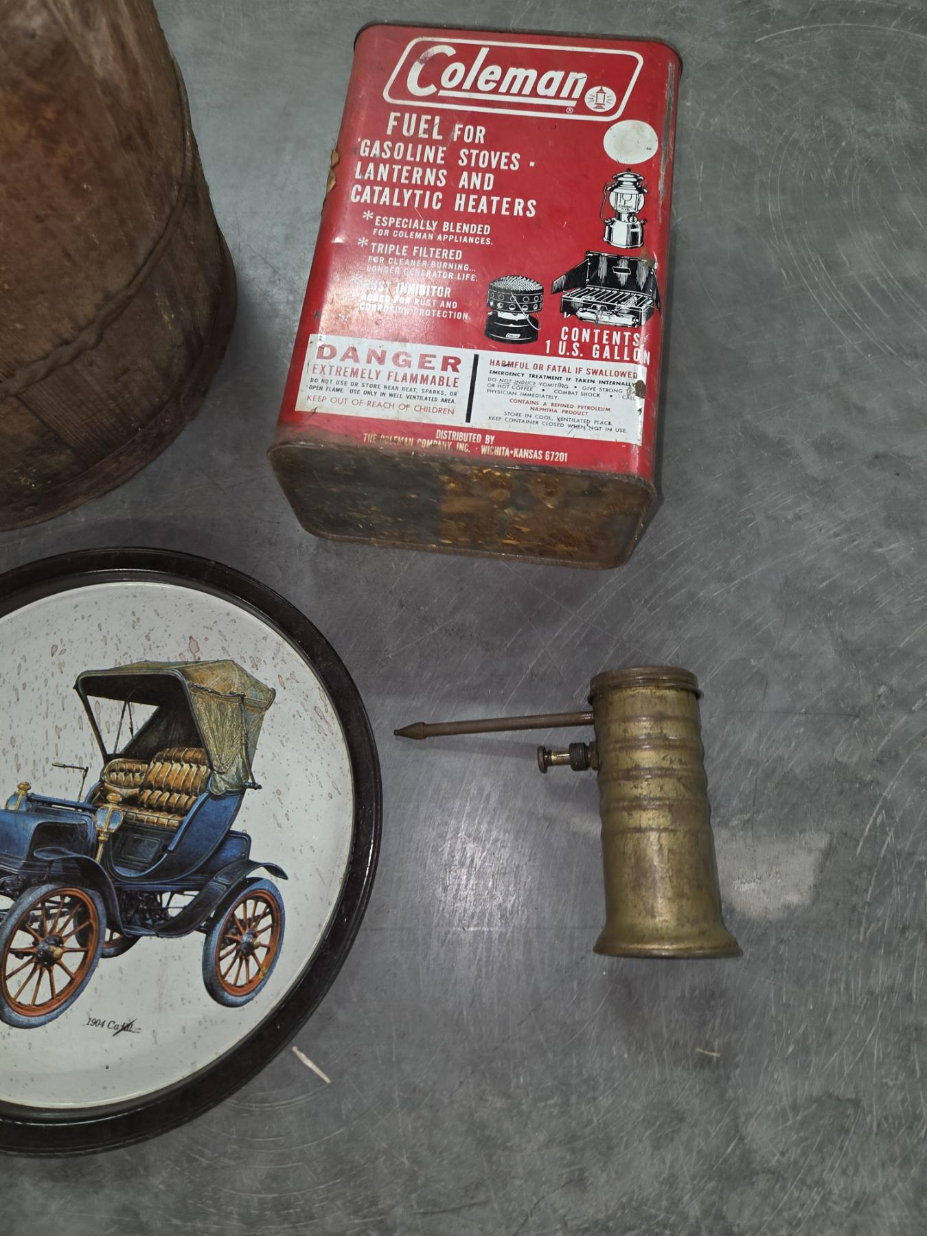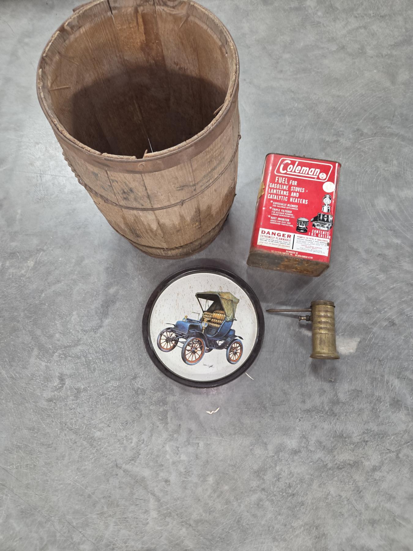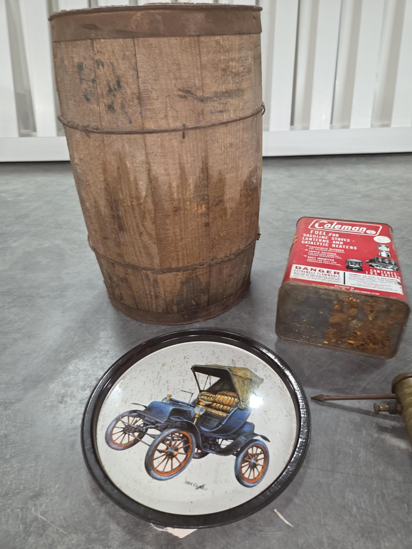 Antique Small Wood Barrel, Tin Tray, Oil Can & Coleman Can