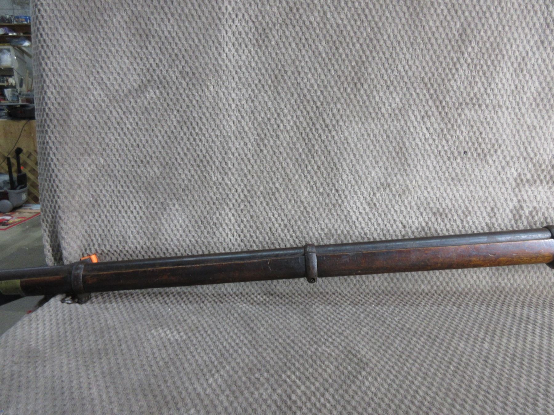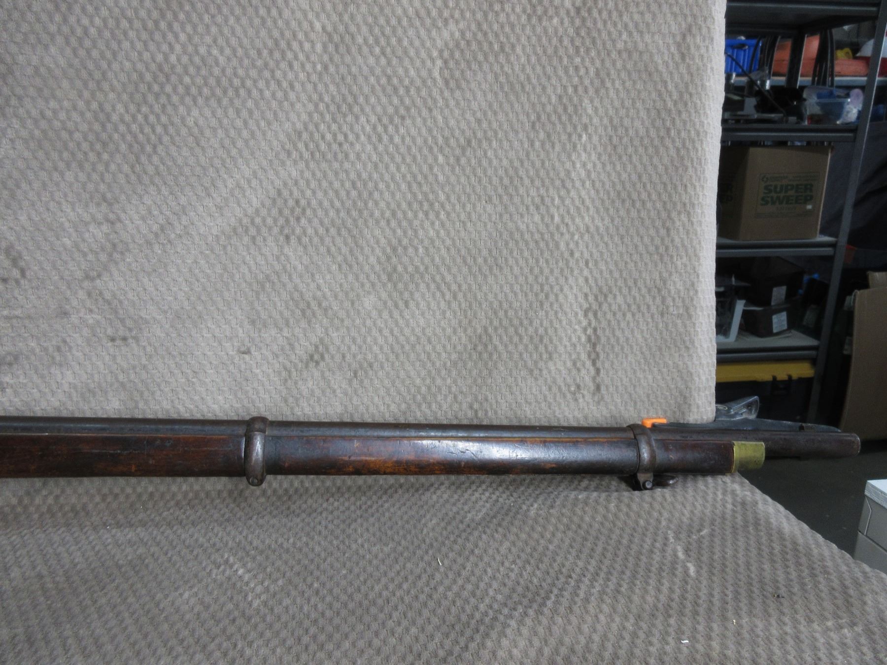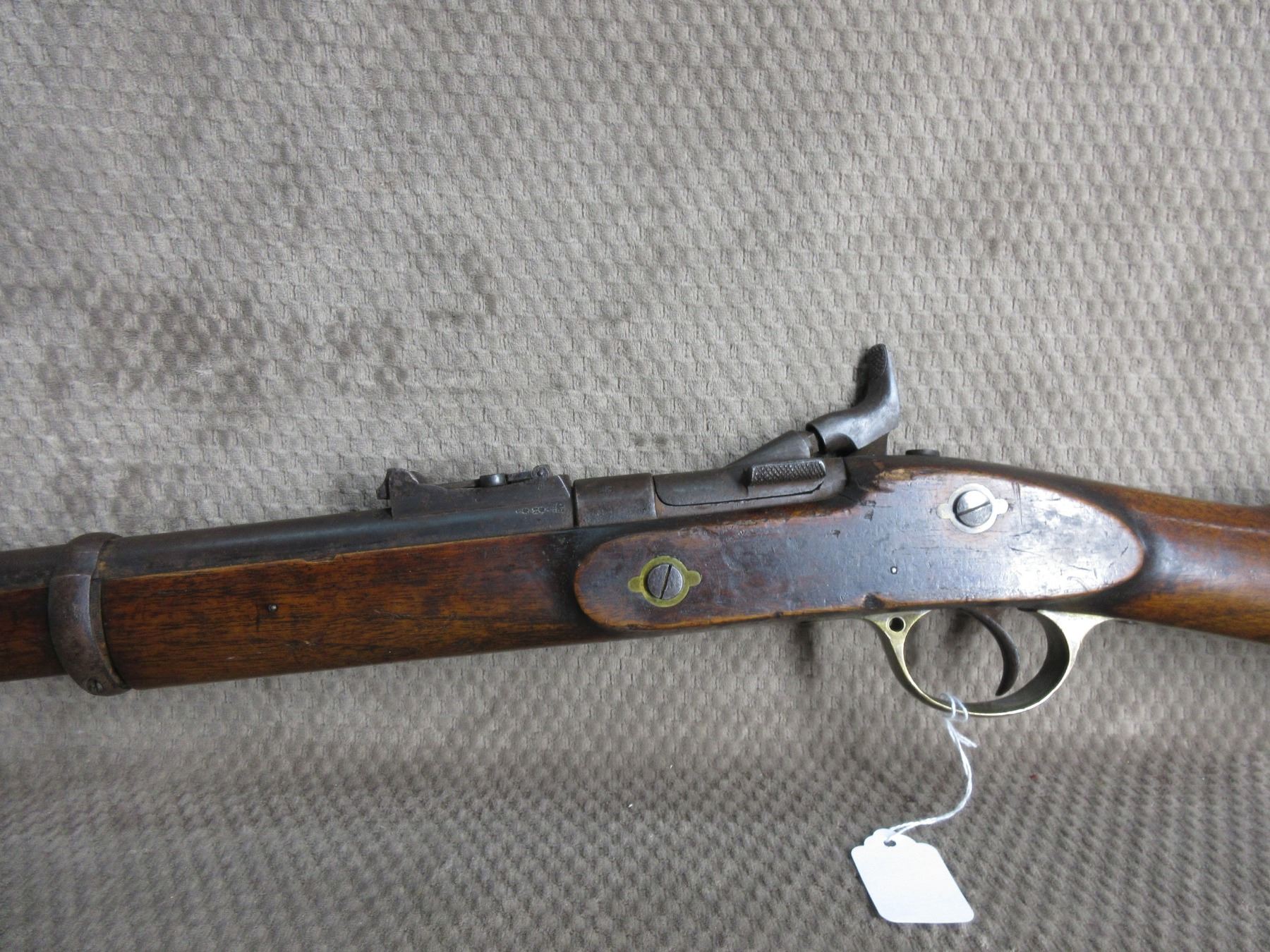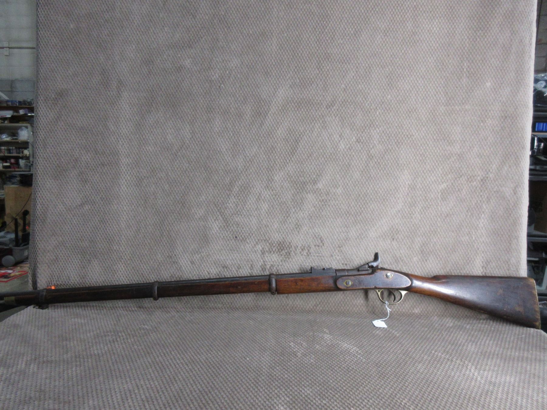 Antique - Snider Enfield 3 Band Rifle in 577 Snider - This single shot rifle is in working order except firing pin has bee shortened or broken. Bluing is brown with some pitting, rifling is good until the last 8 to 10 inches where is is pitted, has both sights, wood appears to be good with usually marks for its age, missing cleaning rod.