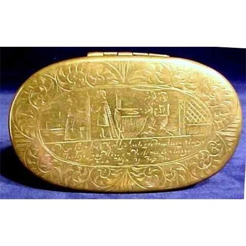 Antique Dutch snuff box of brass with genre domestic scenes beautifully engraved on both sides. This antique oval brass snuff box has an elaborate baroque hinge as found on 17th C. boxes -- many of such hinges do not survive, but this one is in fine condition. Snuff box lid genre scene looks like a wedding or betrothal, bottom is engraved with more wording and scrollwork. Brass snuff box top and bottom each have edges of fine reeding. 5"W oval. Snuff box is in excellent, original state (no repairs), fine patina, with normal surface wear. Ca. 1680-1720.