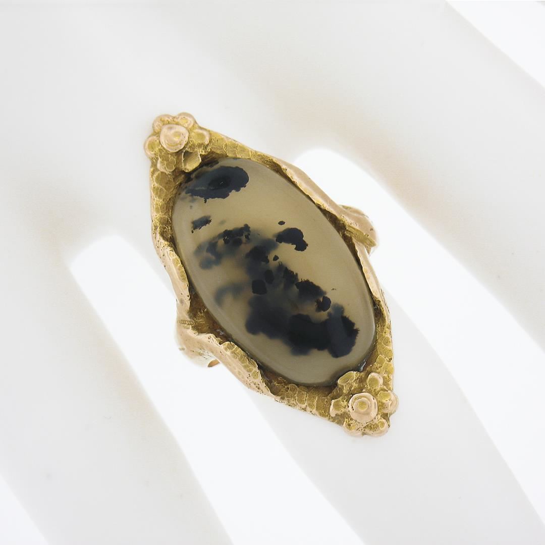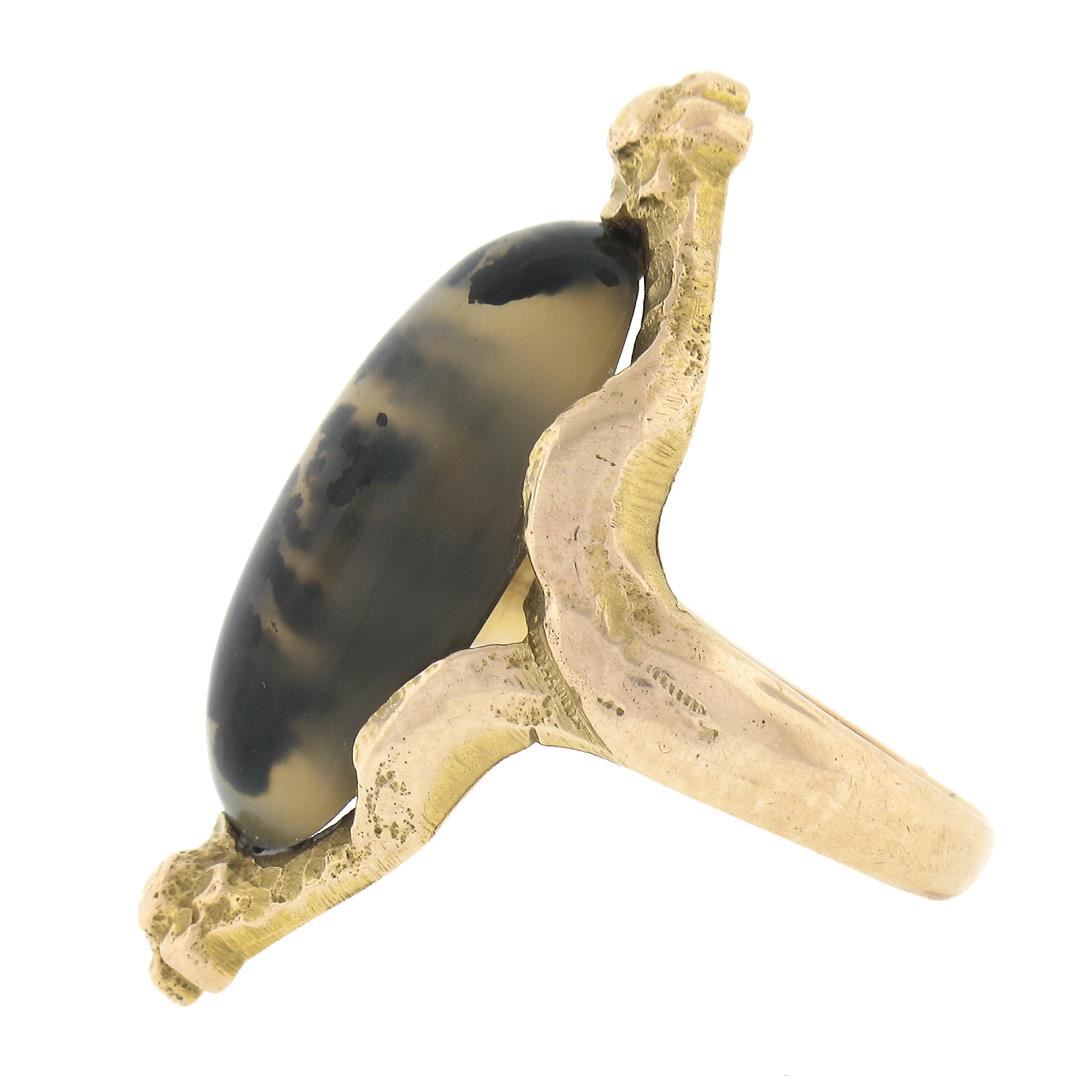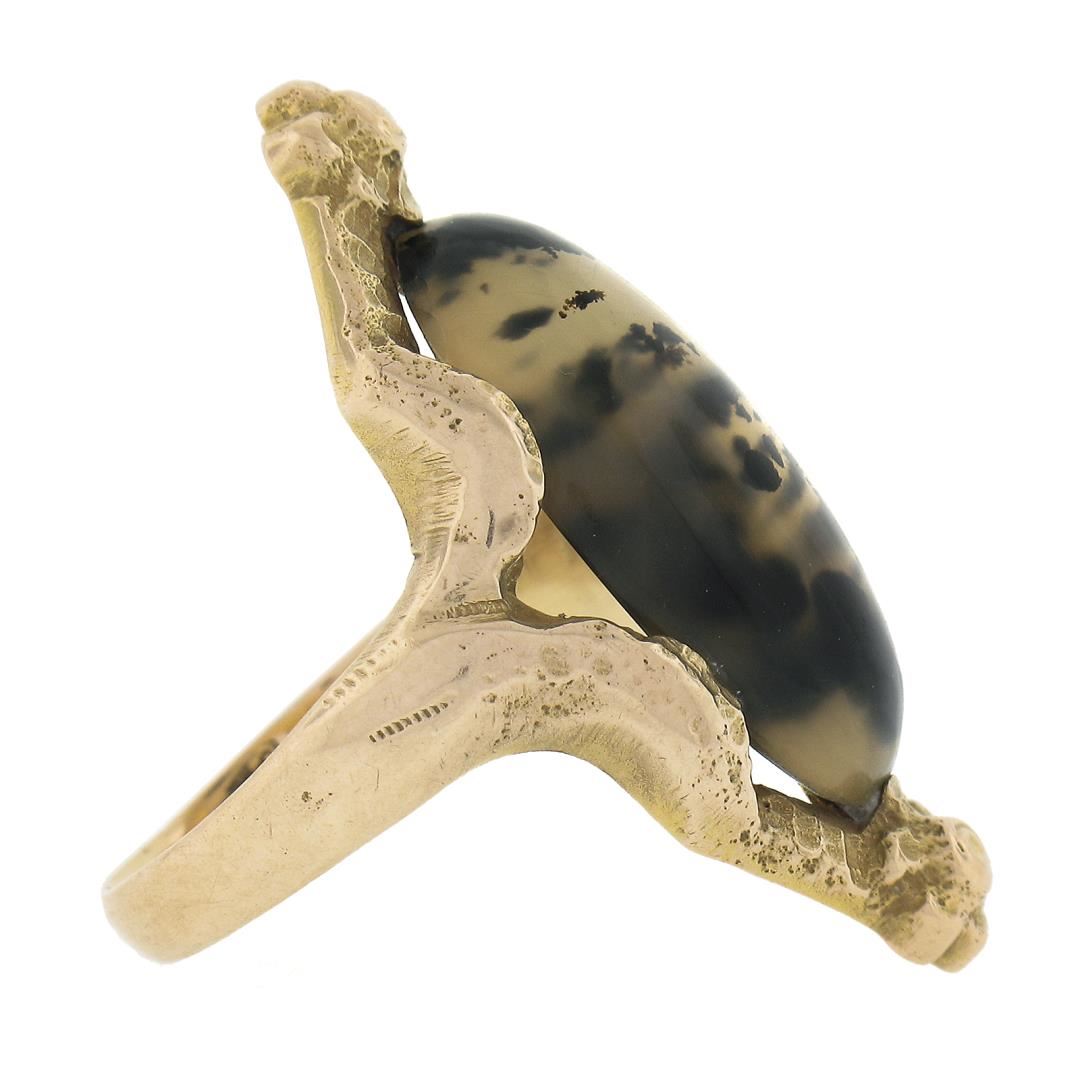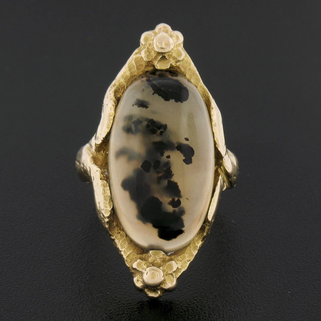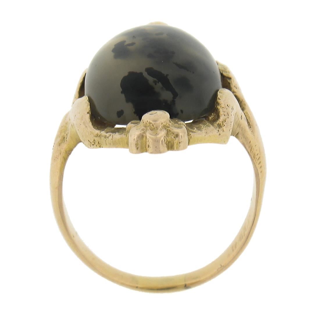 Antique Solid Gold 20x11.8mm Cabochon Prong Moss Agate Solitaire 3D Floral Ring