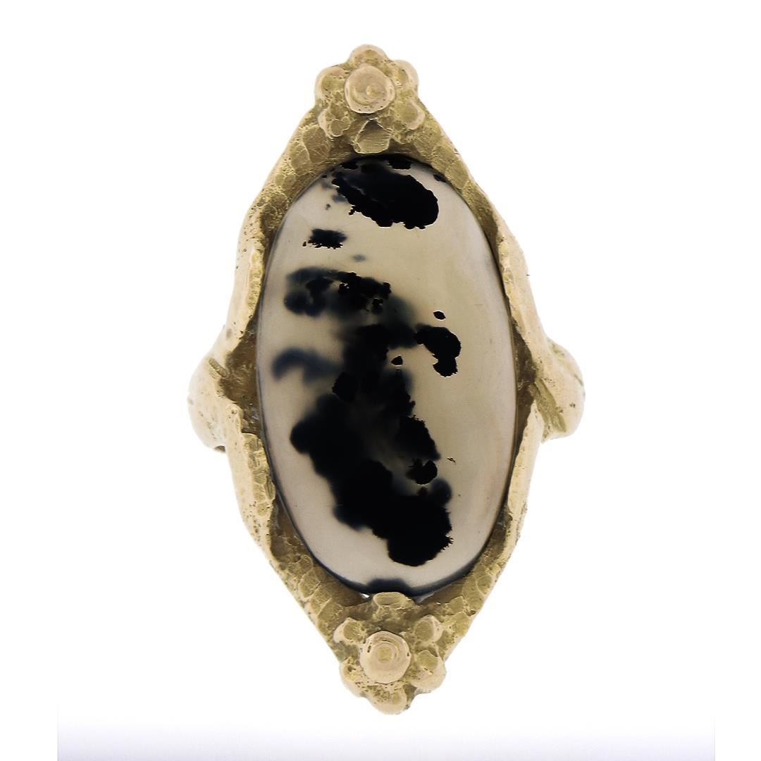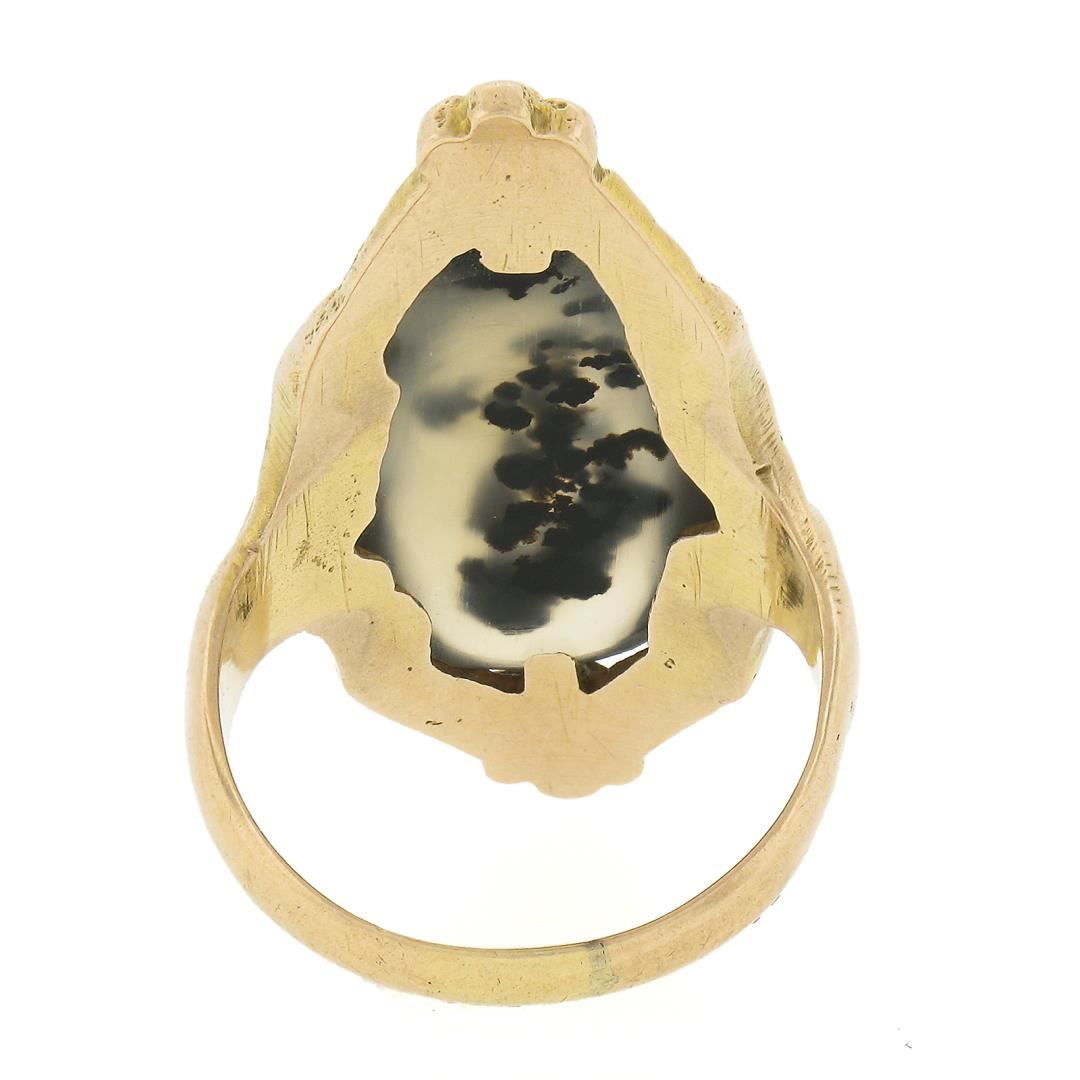 An antique solid 13 yellow gold ring, with 1 cabochon cut matural moss agate (20x11.8mm). The ring is size 6.0, weighs a total of 6.91 grams, and measures 30.7mm wide.