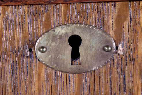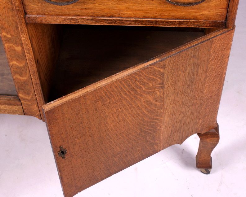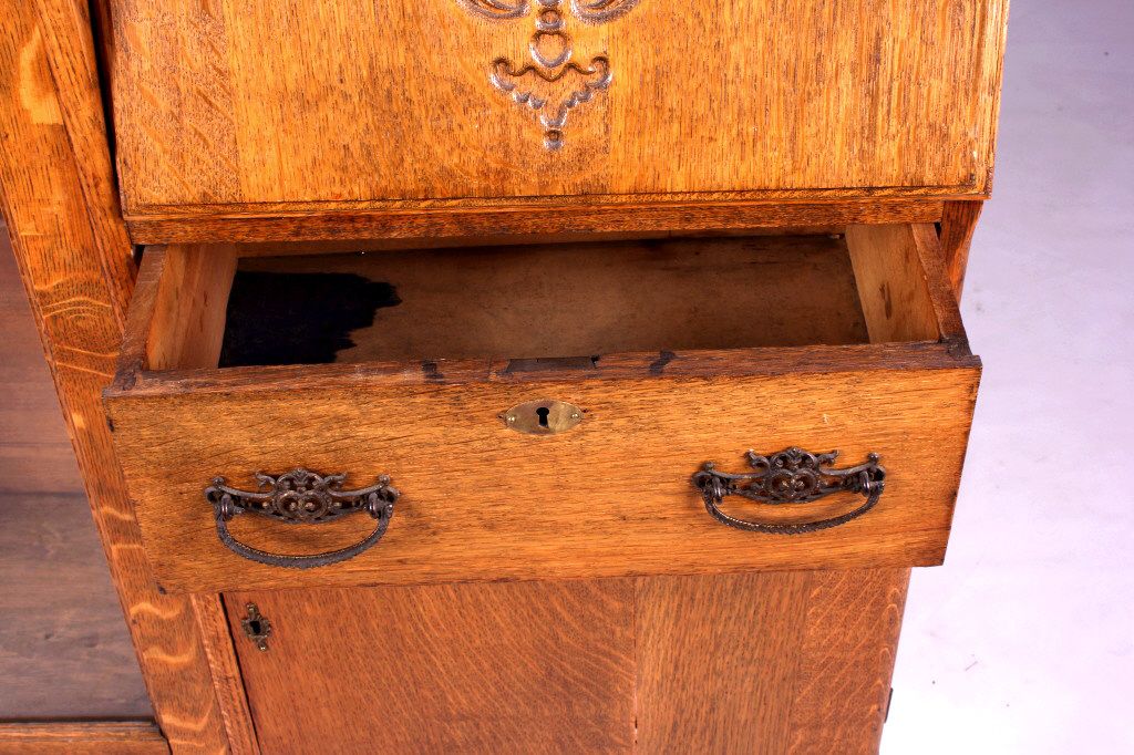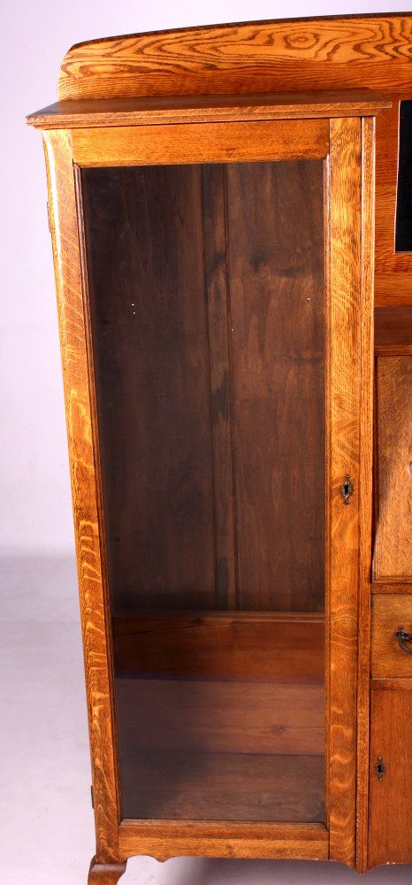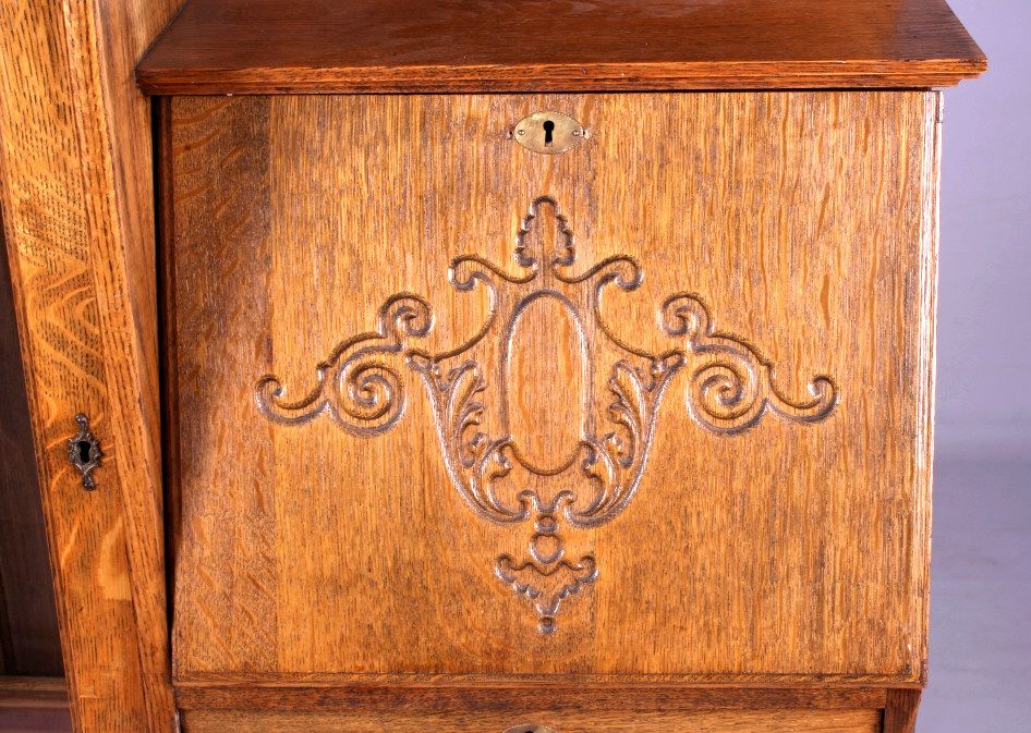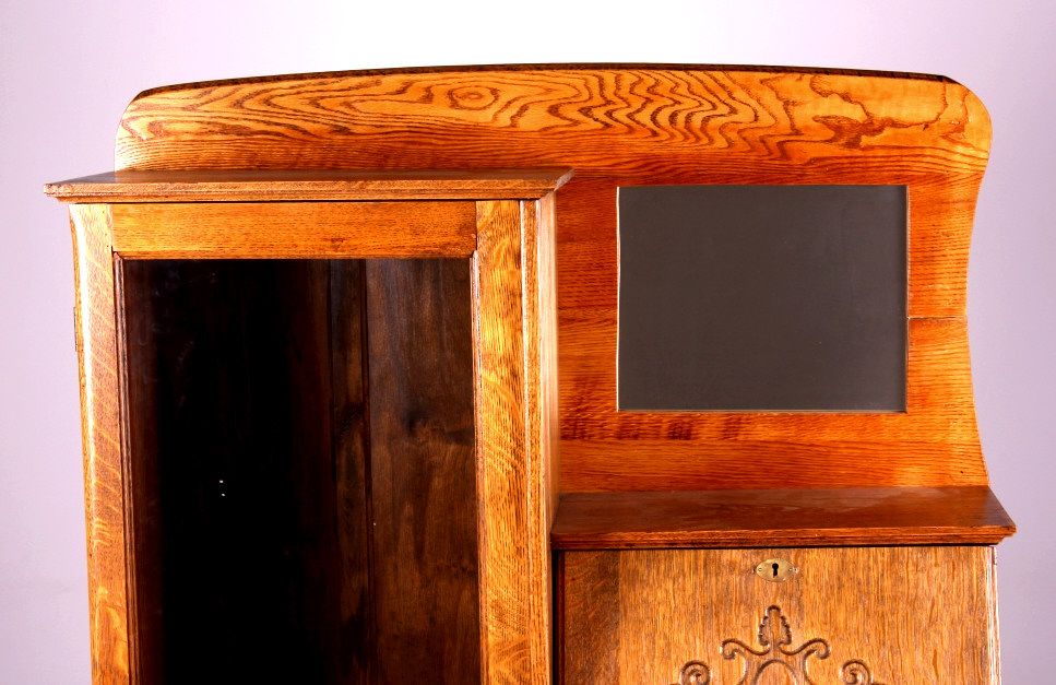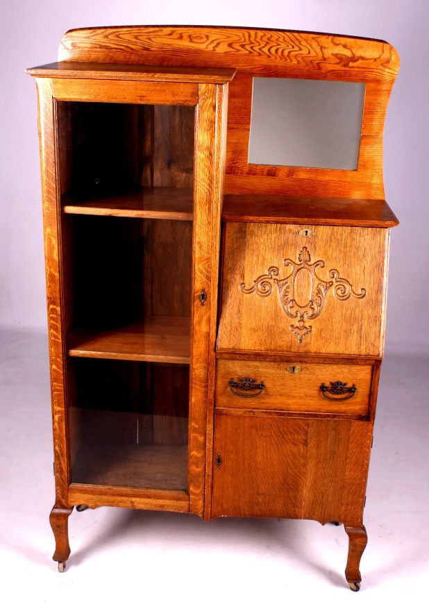 This is an antique secretary. The secretary is made from solid oak. It has a mirror and glass door. There is a drop down drawer to reveal a series of pigeon holes. There is also a drawer and a door on the bottom for storage. Behind the glass door are two shelves that provide a great display for collectibles. The antique oak secretary is in very good condition. It measures 38" wide, 13.5" deep and 63.5" tall.