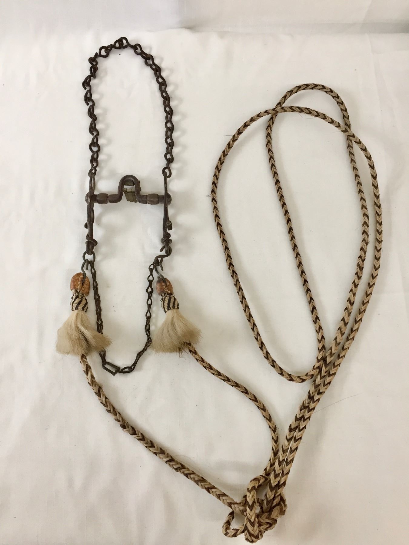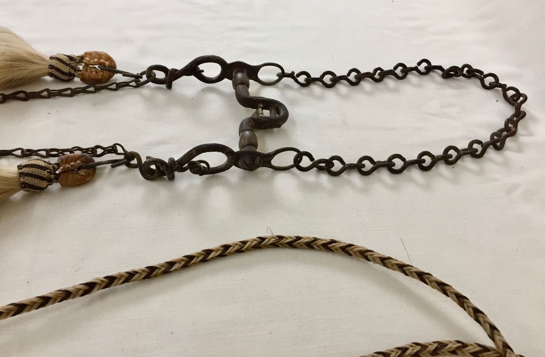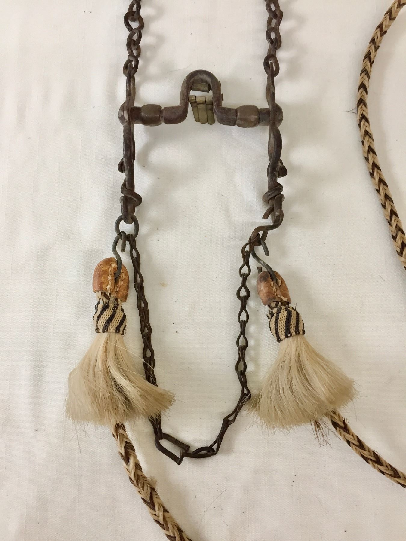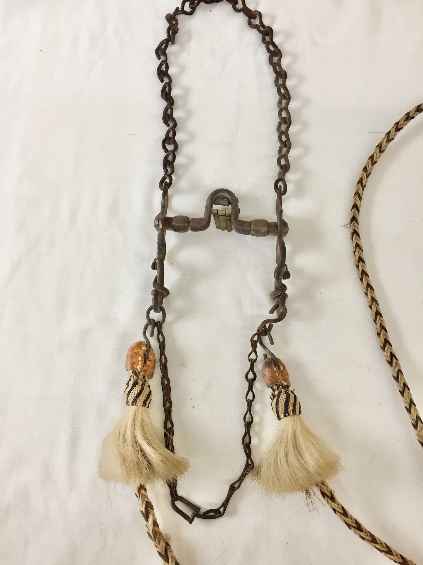 Description: Offered for sale in this lot is an older, antique Spanish bit with hand braided horsehair reins. The shanks of the bit have snake designs. Maker: Unknown.