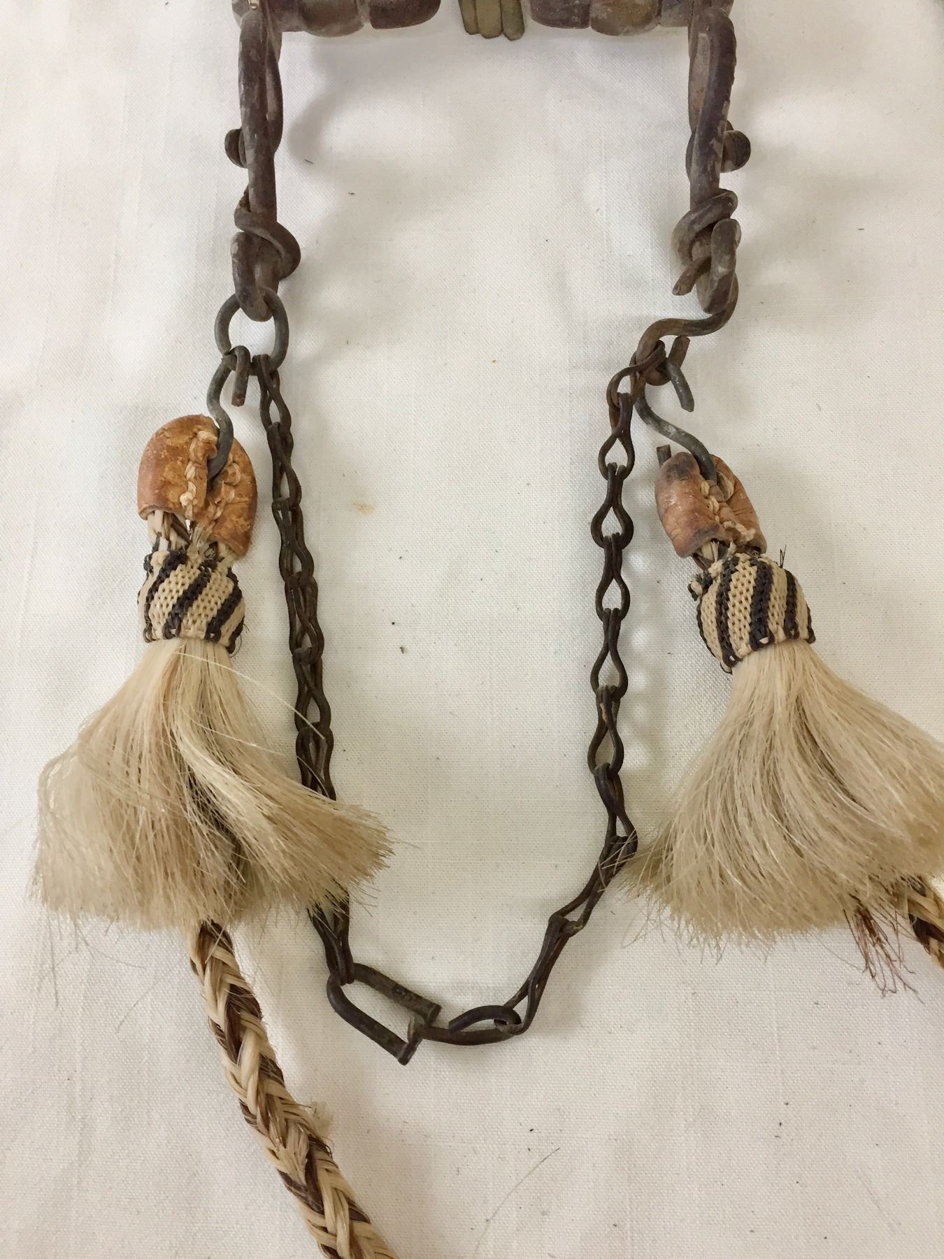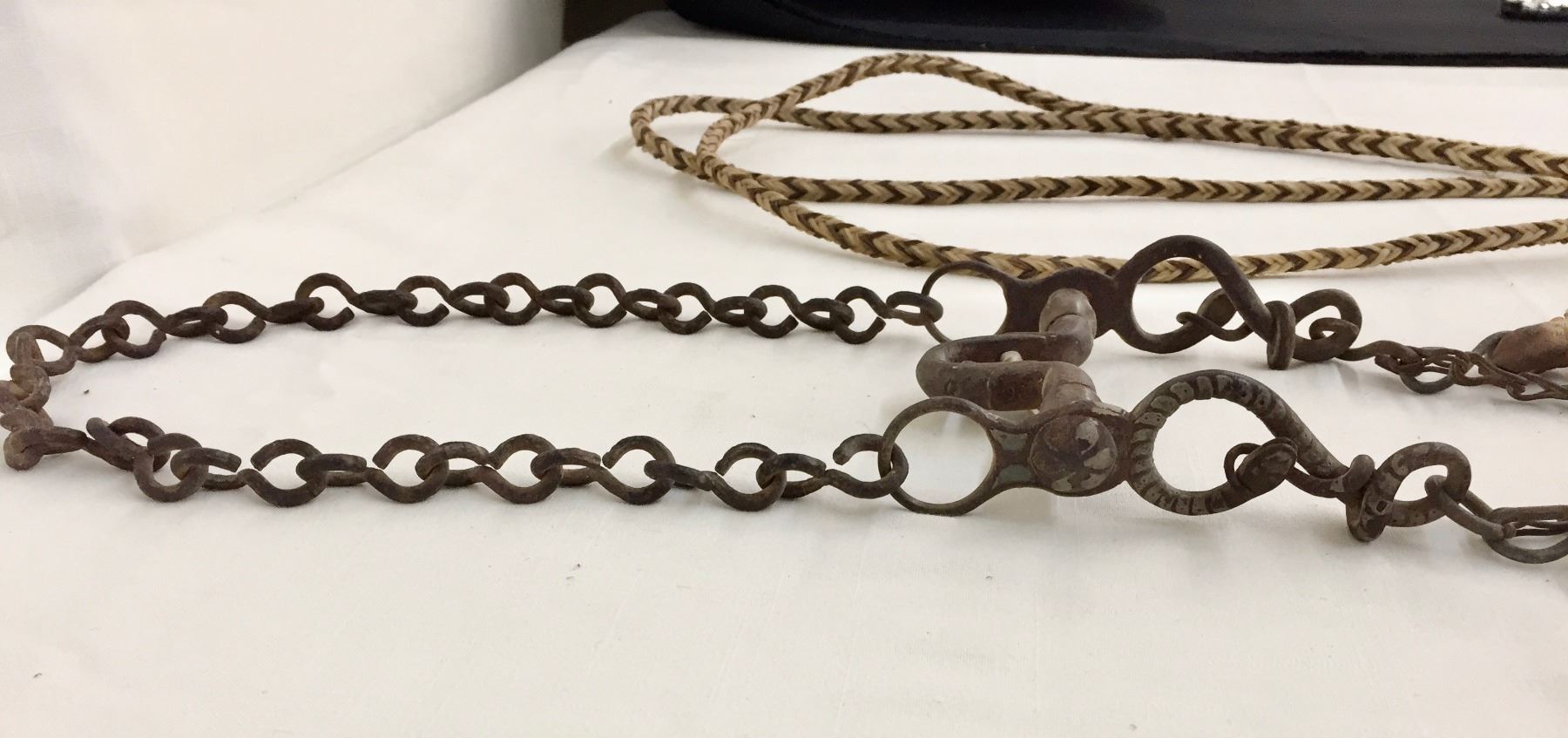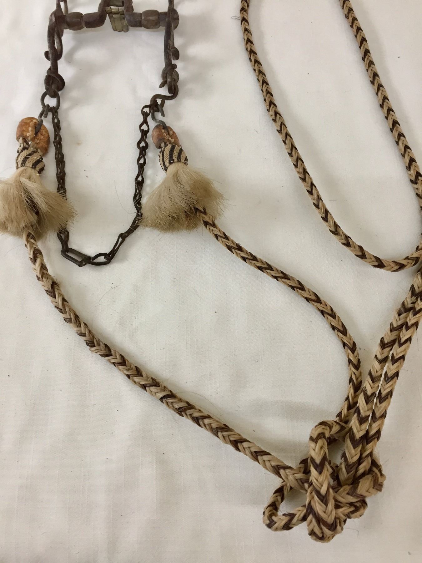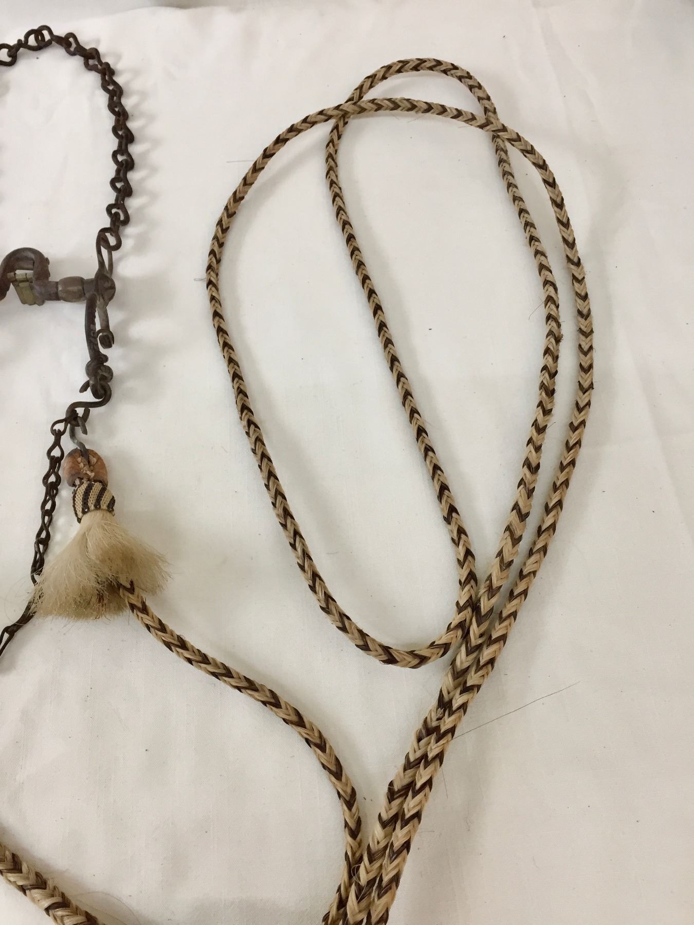 Description: Offered for sale in this lot is an older, antique Spanish bit with hand braided horsehair reins. The shanks of the bit have snake designs. Maker: Unknown.
