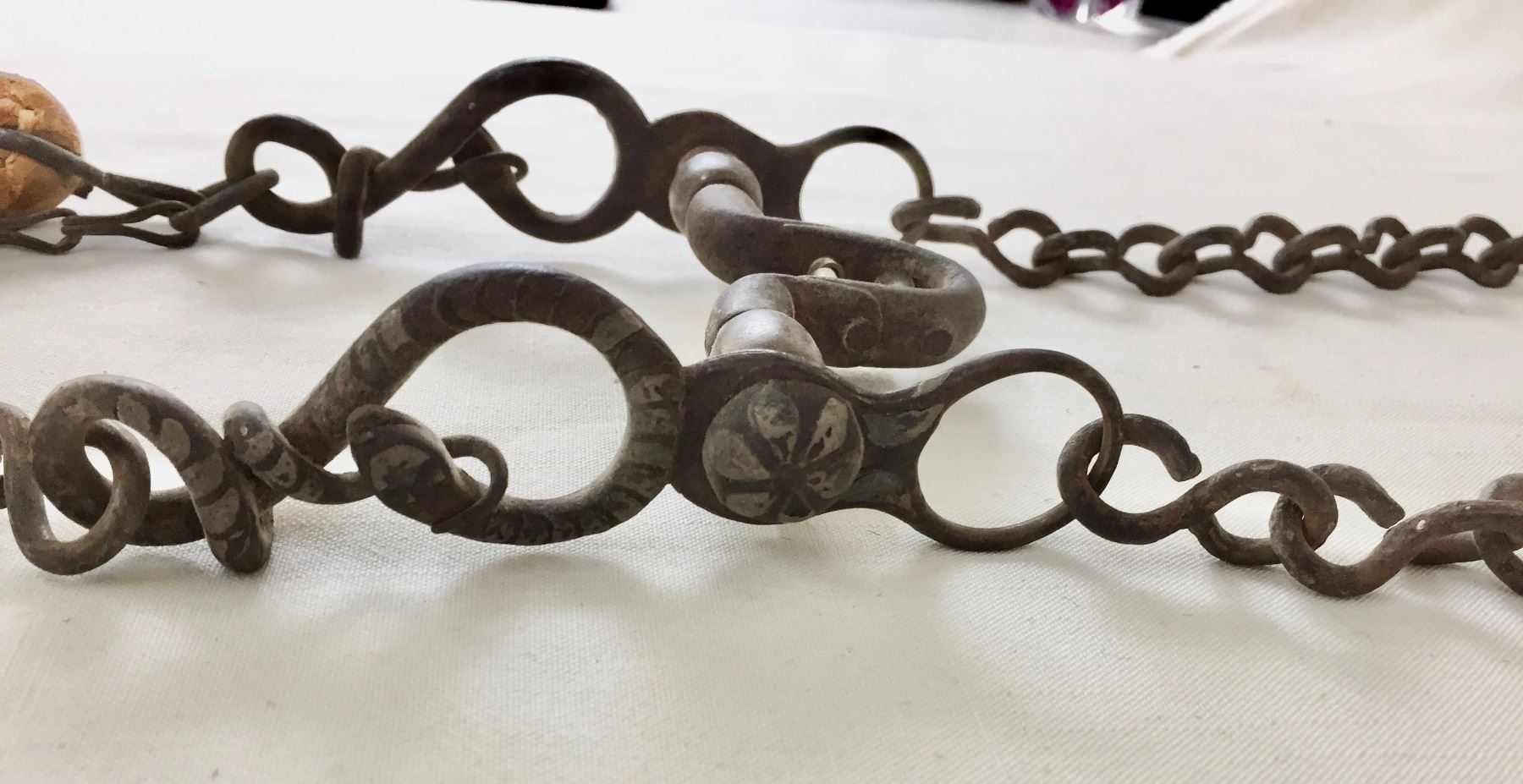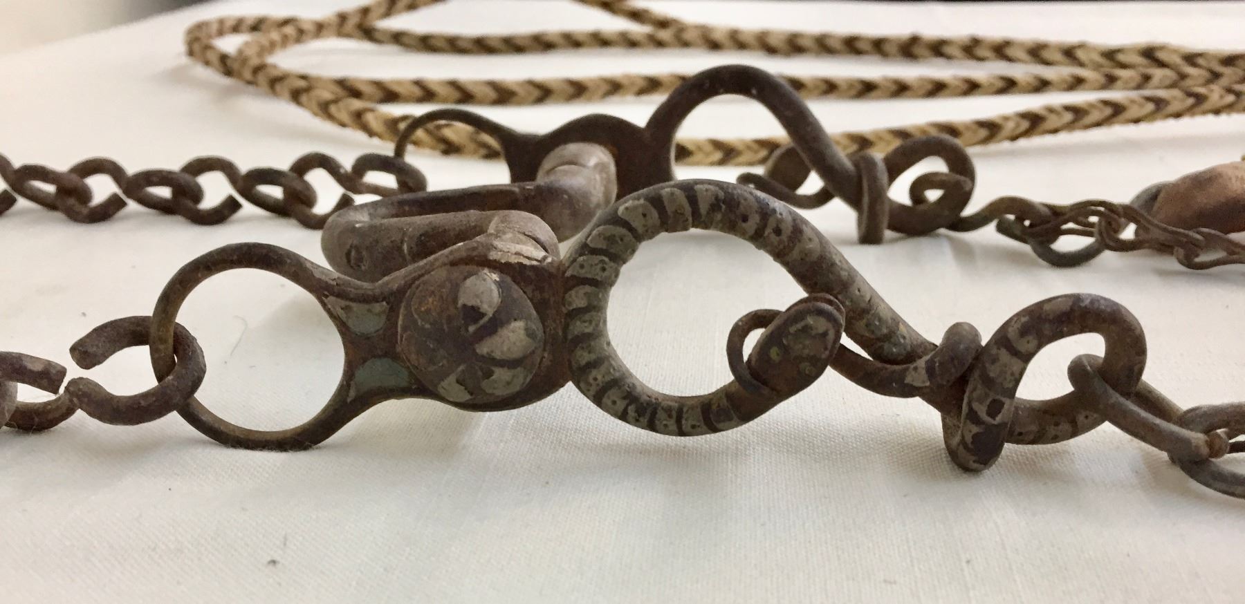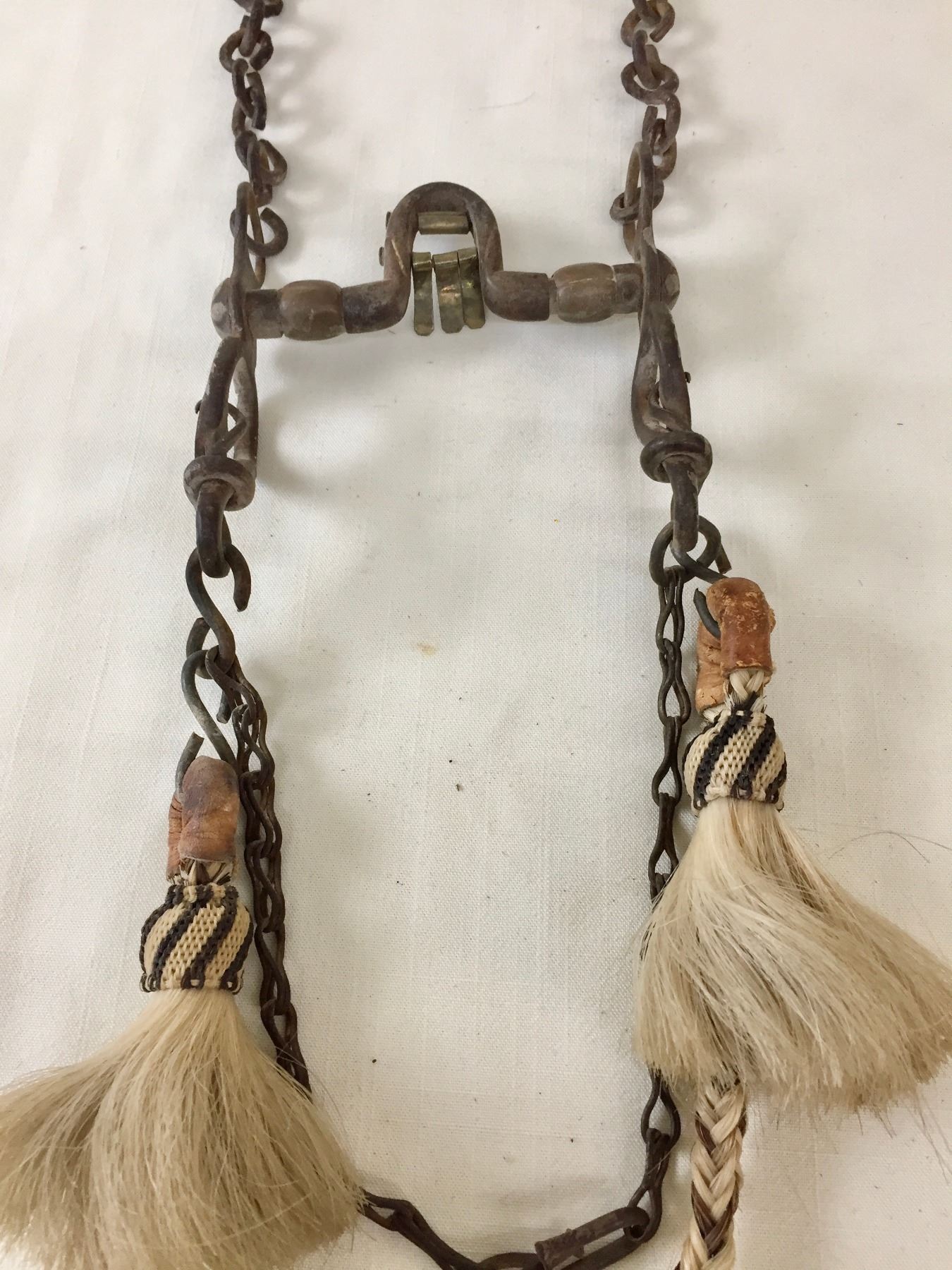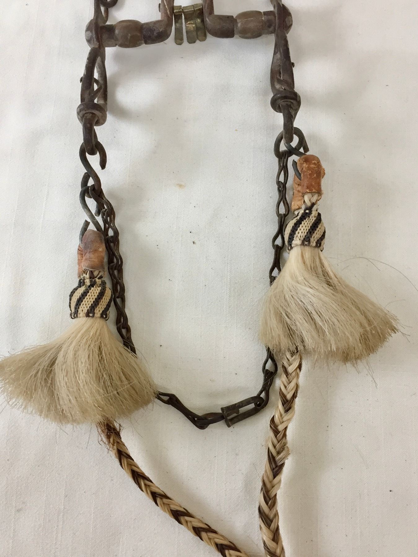 Description: Offered for sale in this lot is an older, antique Spanish bit with hand braided horsehair reins. The shanks of the bit have snake designs. Maker: Unknown.