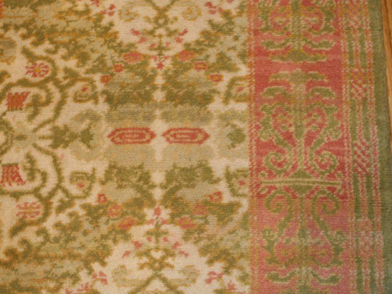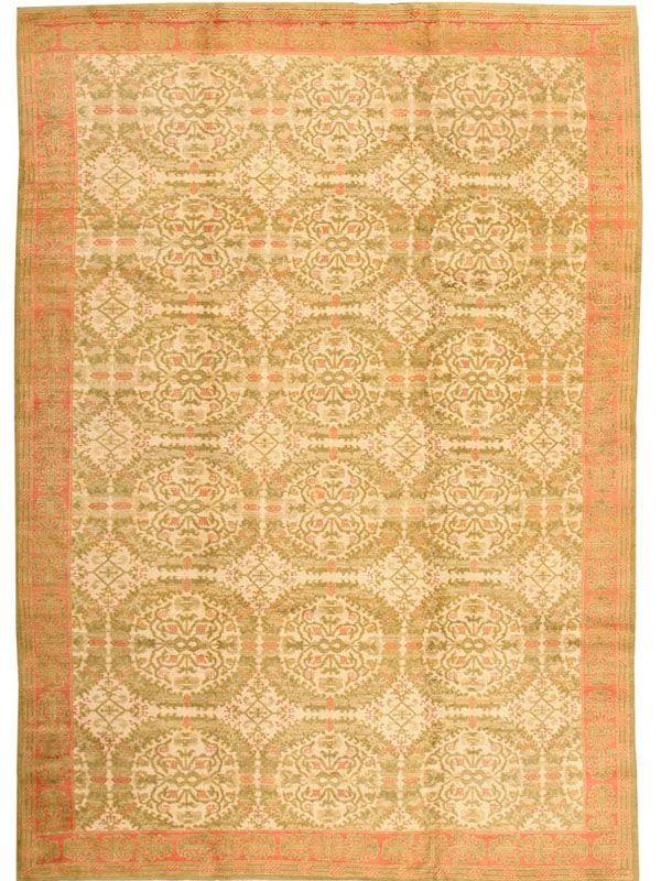 8.00 x 11.03 1920's Antique Spanish Carpet, Spain - This elegant antique Spanish carpet is the proud heir of a long tradition or rug weaving in the Iberian Peninsula reaching back to the late Middle Ages. Its circular medallion format goes back to Timurid models introduded to Islamic Spain in the fifteenth century. Yet it is rendered with a rich wreath-like floral detail and soft, golden coloration that are distinctly Spanish or European. Subtle touches of red ad a hint of excitement amidst the classic restraint.
