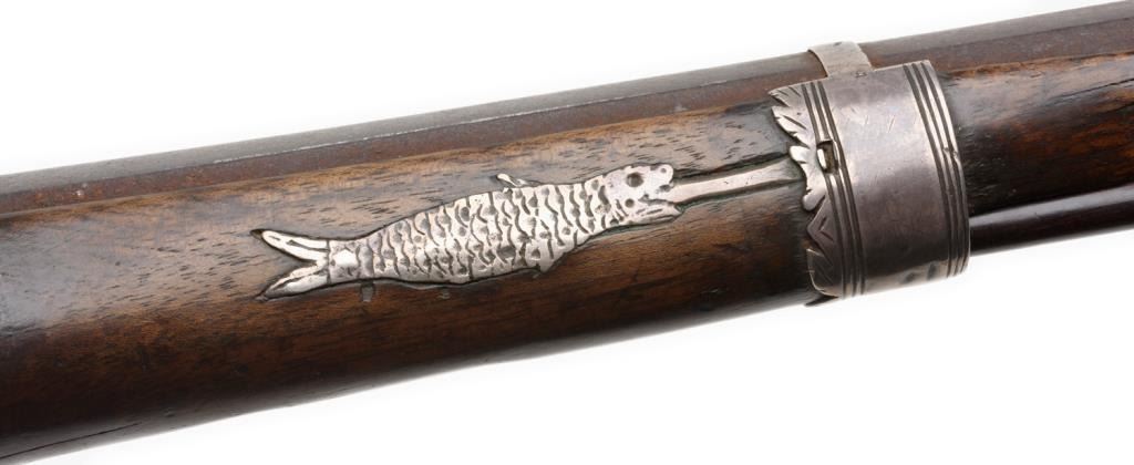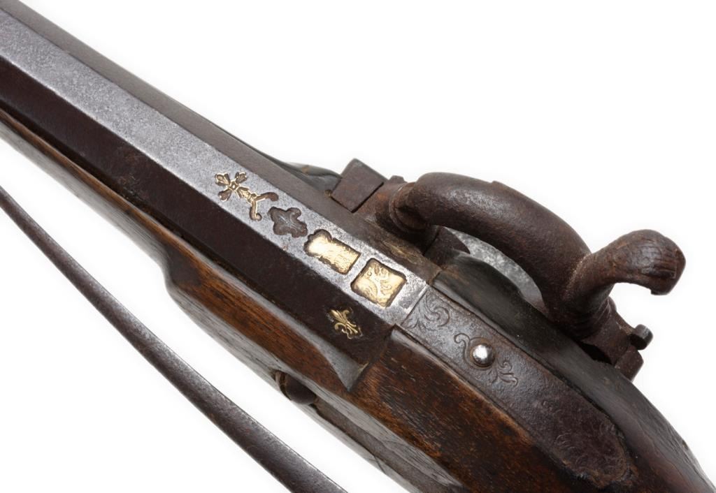 Antique Spanish miguelet carbine, approximately .70 caliber, 25” barrel with gold maker’s marks on top and both sides of barrel at breech, large iron belt hook on left side of half stock with silver barrel band and a pierced silver serpentinlaid into the right side of the fore stock; horn tipped wood ramrod. This great looking early piece is un-cleaned and displays a dark brown patina to metal surfaces; working action and worn stock from years of carry and storage; very oldrepair to butt stock at rear; easily could have come to the New World as it was previously in an old Texas estate. Est.: $1,500-$3,000.