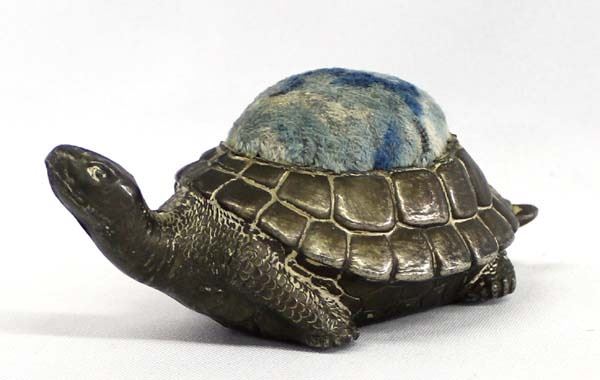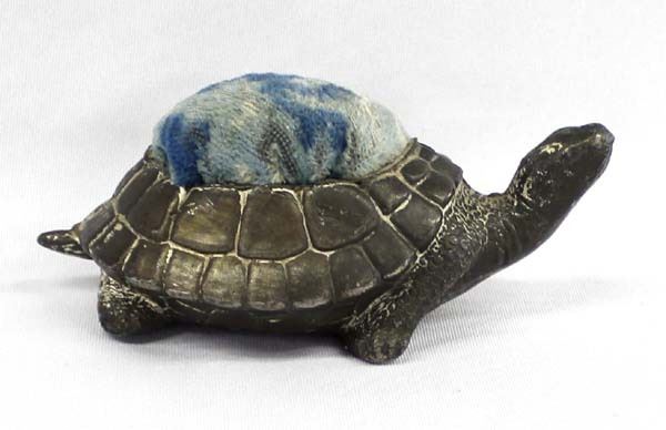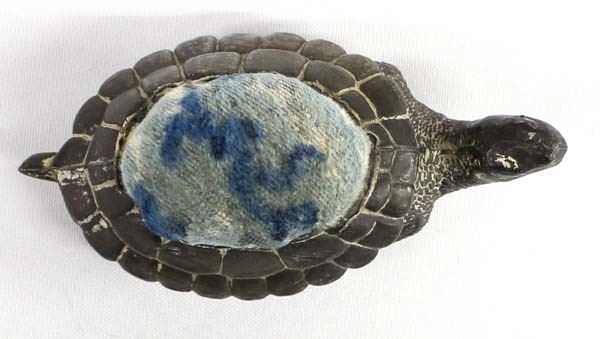 Antique Victorian Spelter Metal Turtle Pin Cushion, measures 2.5'' x 5'', velvet top