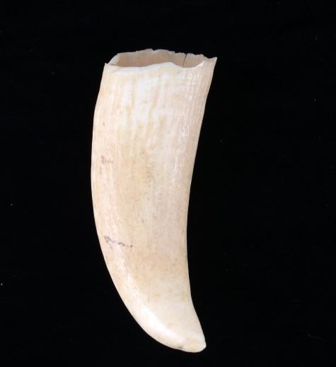 Lot consisting of two matching antique sperm whale teeth. These teeth probably date to the late 19th to early 20th century and came out of an old collection housed in Arizona. The larger tooth measures approx. 5 3/4" in length, and approx. 1 1/4” across the tapered base. The smaller tooth measures approx. 3 5/8" in length and approx. 1 1/2" across the base. Both teeth are especially solid with small tapered hollow cavities at the bottom measuring only about 1 1/2" deep. These specimens display a fine classically curved shape that have not been sanded or altered. They display a lovely cream and beige aged patina. Most sperm whale teeth today have been bought up by scrimshanders who sand and polish the surface to decorate with their unique art. Original unaltered specimen examples like this closely matched set are difficult to find today. Superb display items from a distant time when whale oil illuminated the civilized world. The teeth together weigh 8oz.