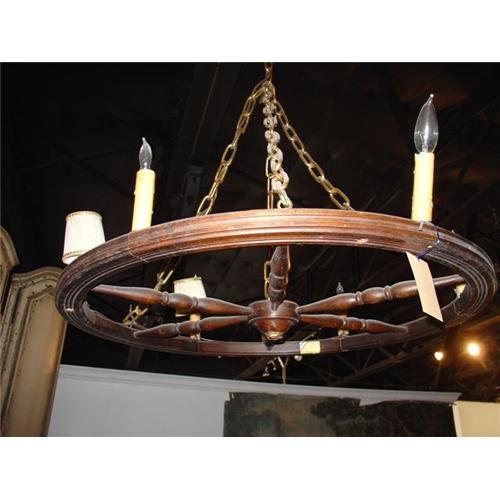 This 6 light chandelier has been converted from a French antique spinning wheel. It is in good condition and is already wired for American use. There is a brass piece at its center with a W or M on it. The chain is also made of brass. Symmetrically spaced holes are seen along the bottom of the chandelier. Please contact us for more photos or information. Thank you!