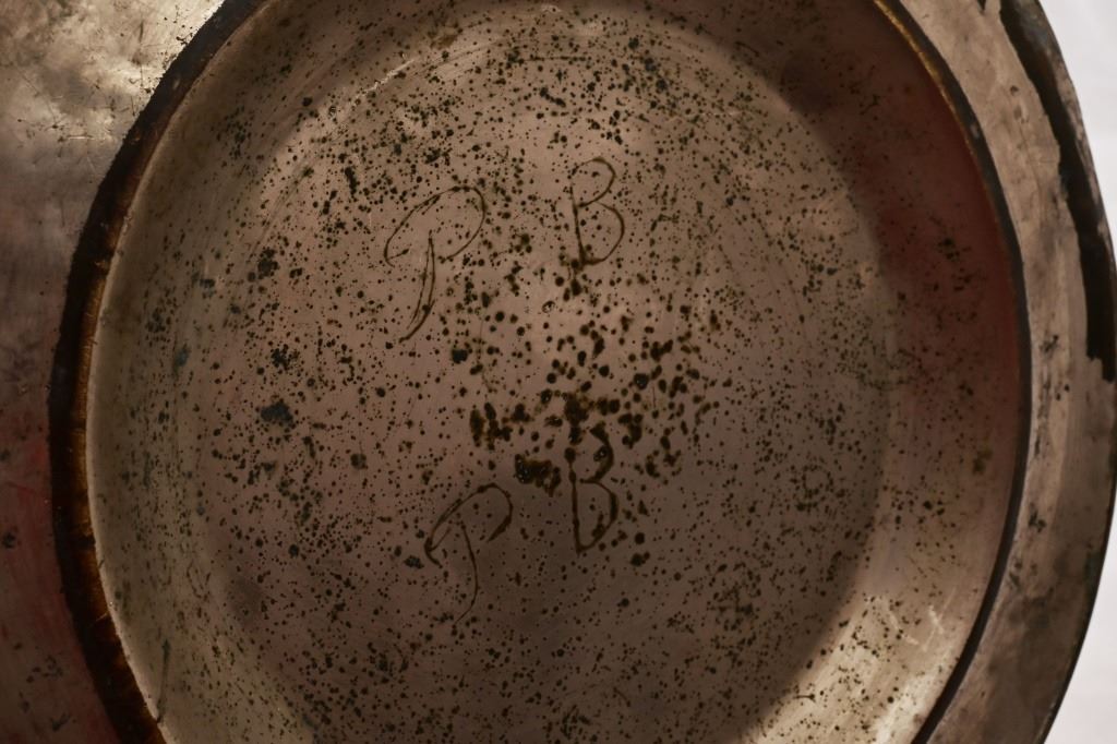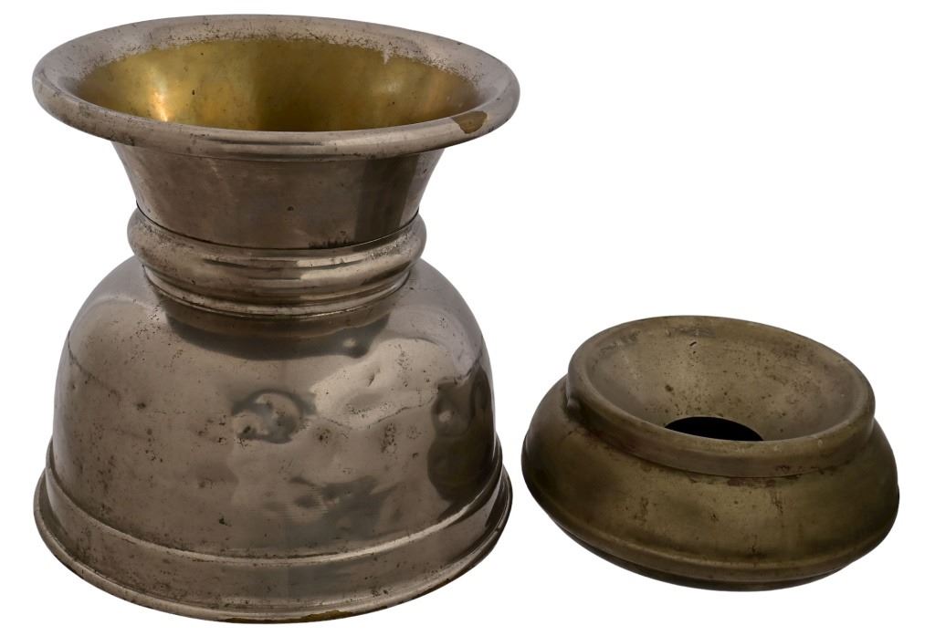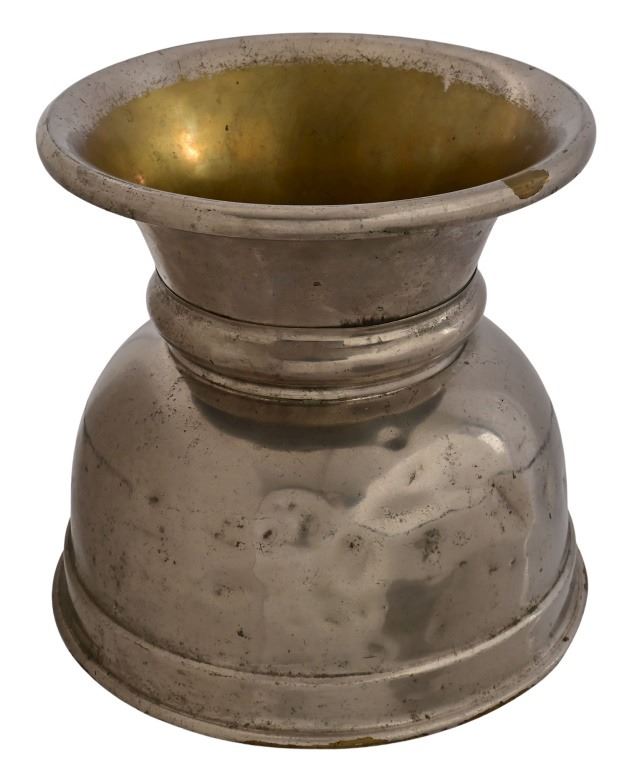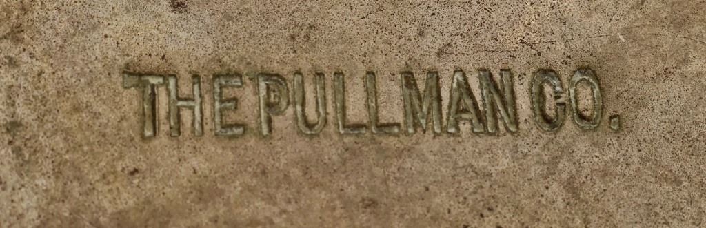 Nickel-plated brass larger spittoon measures 8.5" x 9". Smaller spittoon is marked "The Pullman Co." and measures 3" x 7.5"