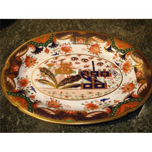 A Beautiful Porcelain Platter, of Ovalform, Circa 1810, Made by the Spode Porcelain Factories of England. Very Graceful form of Balanced proportions accented in Beautiful Gilt work. Done in the Wildly Popular "967" Pattern, a variant of the Japanese Export Porcelain in Style, in Vivid Colors and Delicate Gilding used to depict stylized natural scenes, in this case, a Garden segmented by a Bamboo Fence. Marked on the bottom with a "967" in Spode's Rust-colored signature script. Excellent condition, with no breaks, chips, cracks or repairs of any kind. No known wear to painting or gilding.