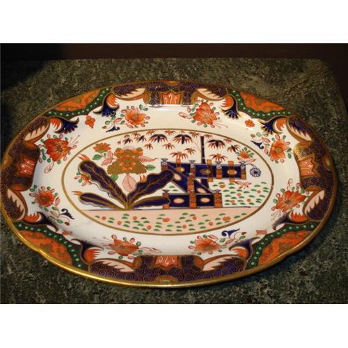 A Beautiful Porcelain Platter, of Oval form, Circa 1810, Made by the Spode Porcelain Factories of England. Very Graceful form of Balanced proportions accented in Beautiful Gilt work. Done in the Wildly Popular "967" Pattern, a variant of the Japanese Export Porcelain in Style, in Vivid Colors and Delicate Gilding used to depict stylized natural scenes, in this case, a Garden segmented by a Bamboo Fence. Marked on the bottom with a "967" in Spode's Rust-colored signature script. Excellent condition, with no breaks, chips, cracks or repairs of any kind. No known wear to painting or gilding.