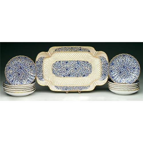 THIRTEEN PIECE COPELAND SPODE ICE CREAM SET. The bottom marked with the Copeland Spode green mark circa 1875-1900. Also marked "Bailey Banks & Biddle Philadelphia". Set consists of a 14-1/2" x 9" tray and twelve 6" round dishes decorated with blue and gold flowers and fish scale design. The set is in very very good condition!
