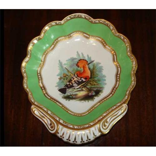 A VERY RARE and Beautiful Shell Shaped dish by the English Porcelain Factory of Spode, Circa 1800, and painted in the Ornithological Pattern "2114", This Dish is painted with the "Hoopoe" Bird, with vivid plumage in a Naturalistic Landscape Setting with the most Incredible detail. Edged with a border of the most finely wrought gilt work, in a "bead and barrel" pattern, off-set by a Beautiful Deep Green Band that makes up the border of this Spectacular Dish. Good early mark on the back, with the name of the Bird. Perfect condition, with no chips, cracks, breaks or repairs of any kind. Please check my other listings for another dish, making an unbelievable and most impressive display!