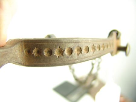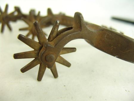 Early/Mid 1900s, Classic old pair of iron spurs with star/dot decorations and 10pt 1-3/4" rowels, plus an extra single spur done in similar style. Good condition. 8"