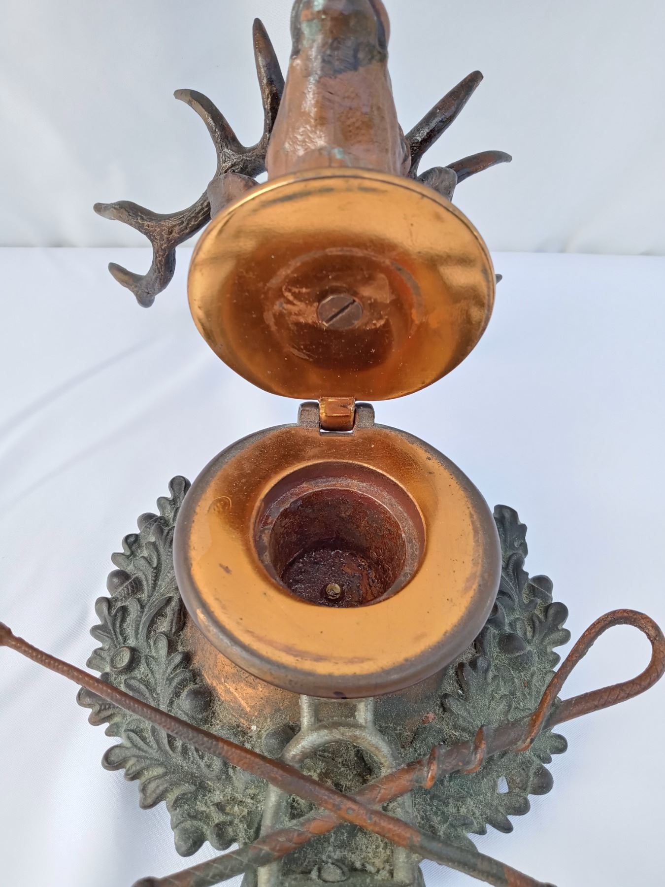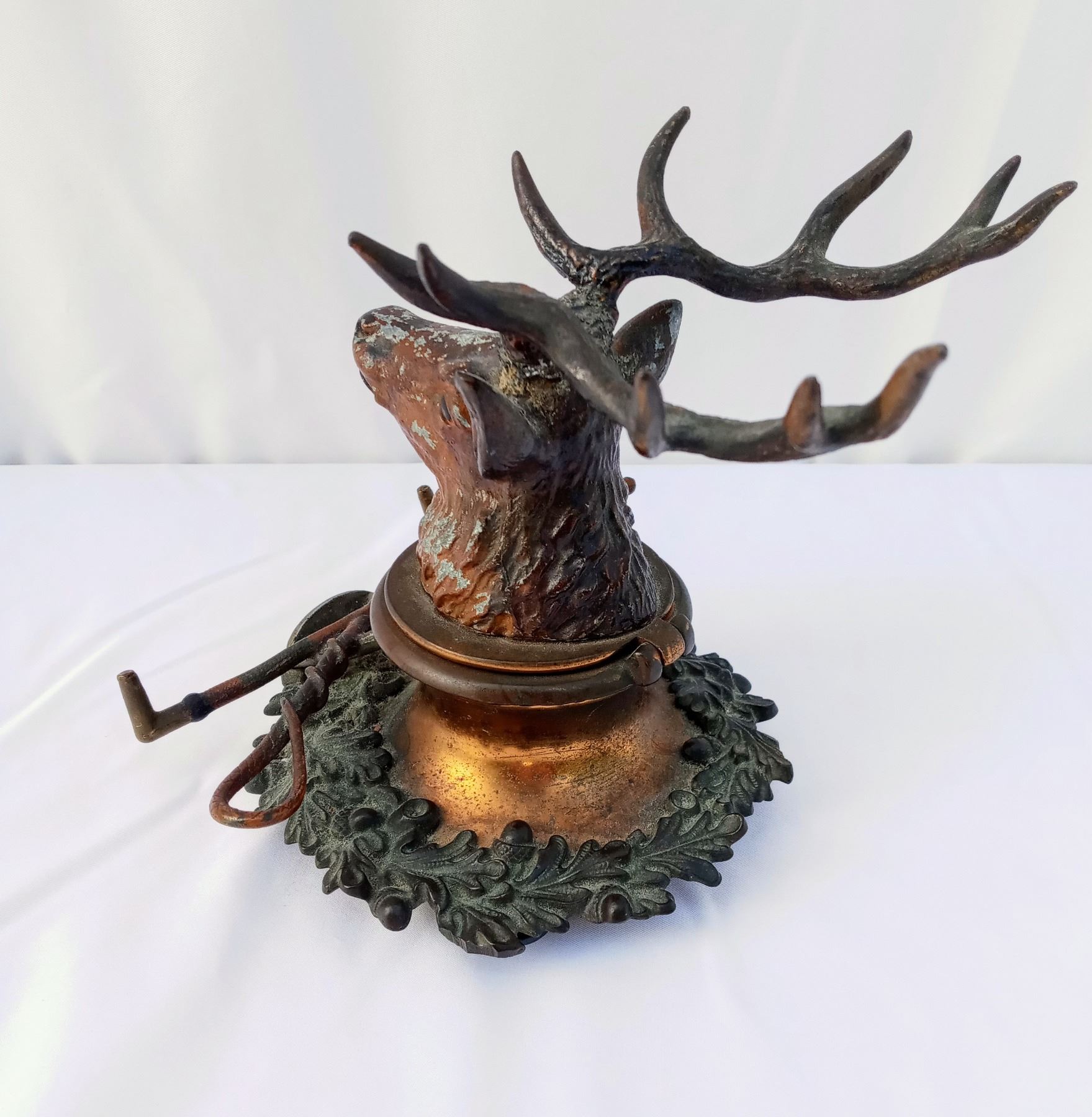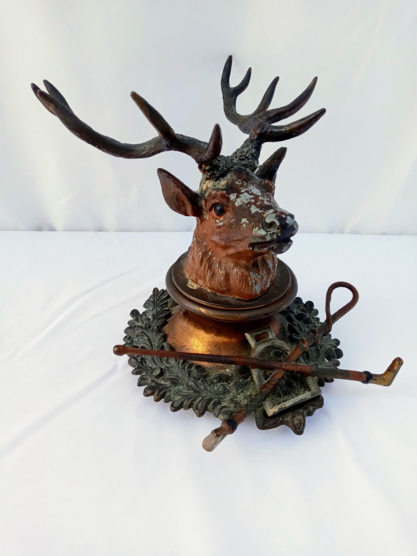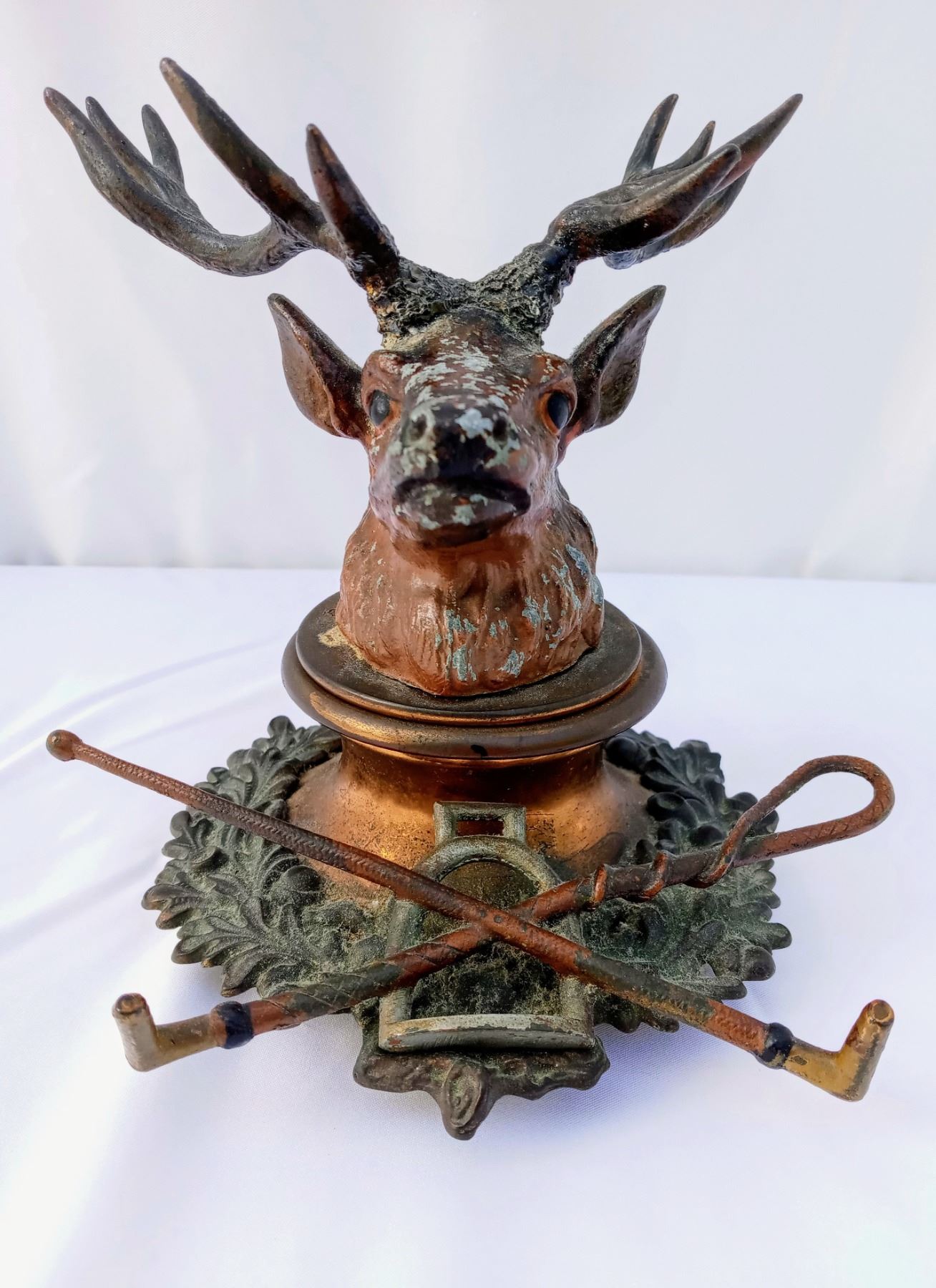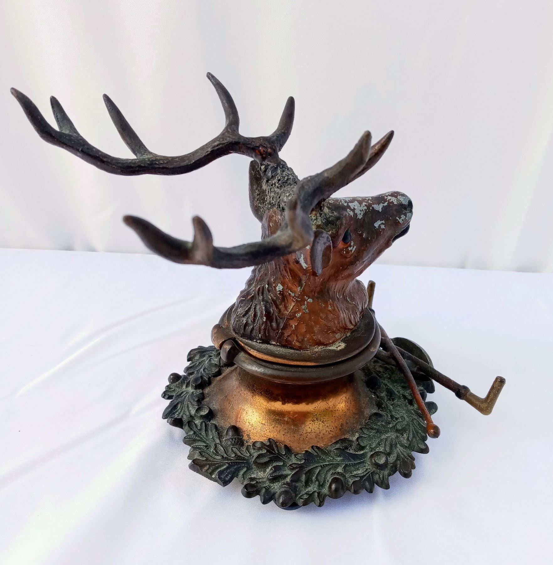 1800 -1900s Antique Bronze Stag Head Ink Well 6" H x 6" W x 6" D. Surface and finish wear; oxidation; dust residue.