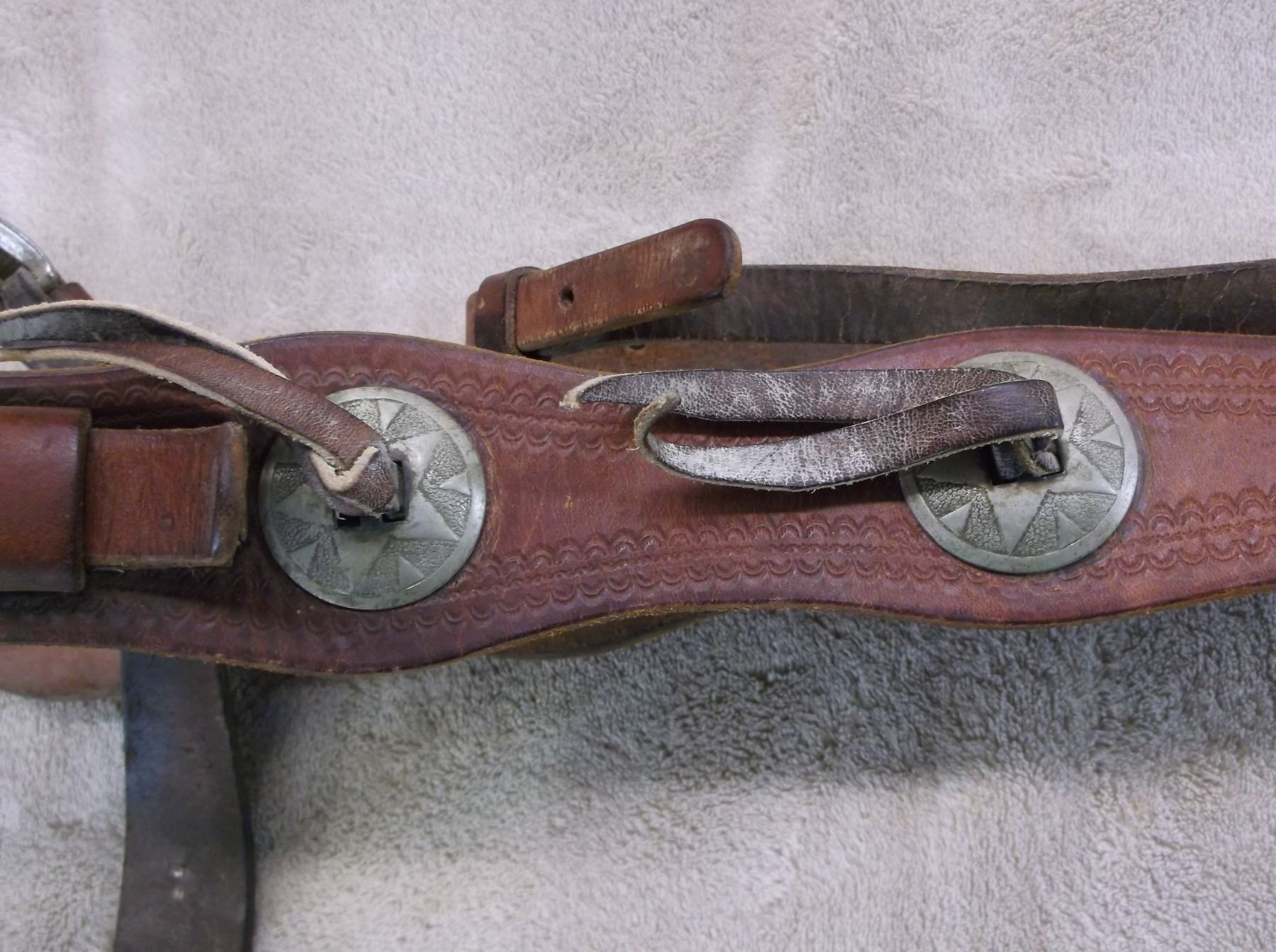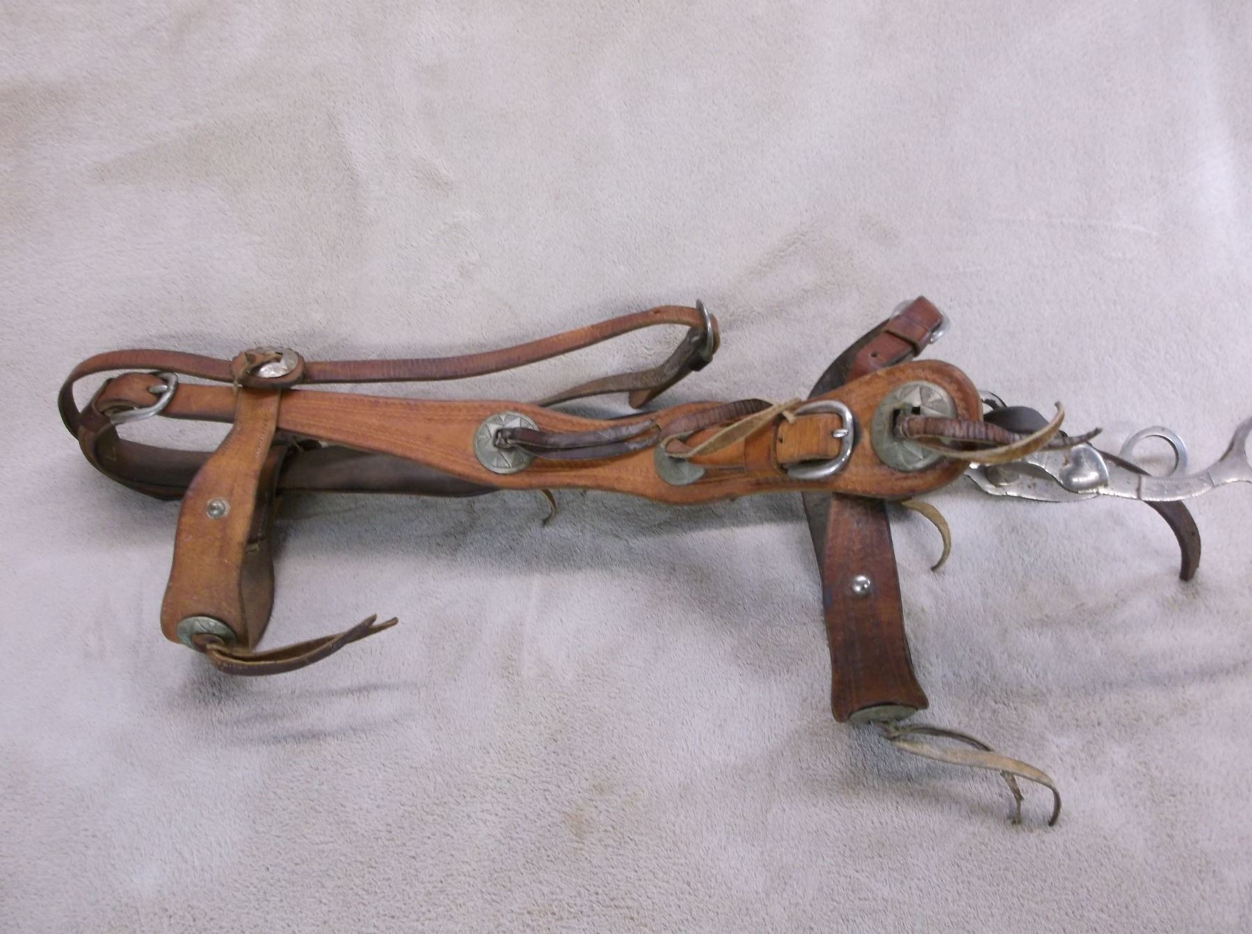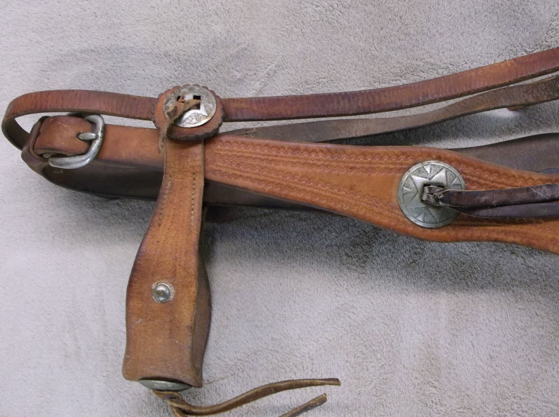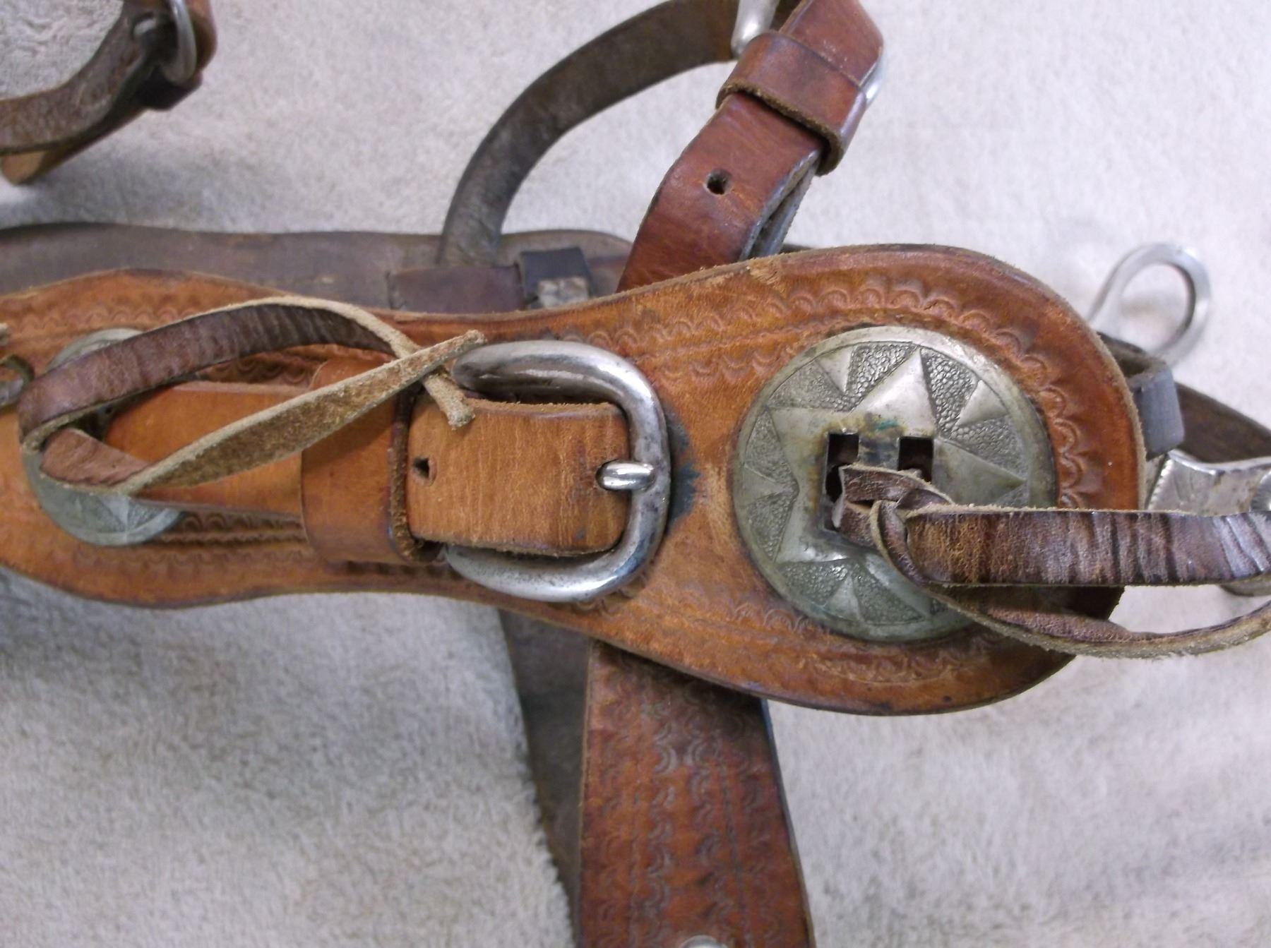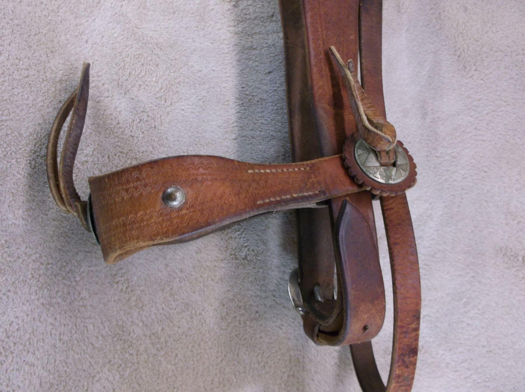 Antique Stamped Headstall- 8 Nickel Conchos- Marked Crockett Silver Overlaid Bit