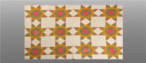 Description Orange, green and red star pattern. Some staining. No tears or holes. Condition (Good). Size 59" x 90".